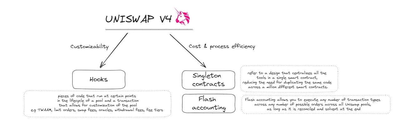 与 Uniswap V3 的区别:1)Uniswap V4 基于 Uniswap V3 的集中流动性资金模型之上;2)Uniswap V4 引入了用于定制池子行为和实现新功能的 Hook;3)Uniswap V4 使用 Singleton 而不是 Factory 模式来创建池,Singleton 模型能够降低成本并简化交易;4)Uniswap V4 在交易对中恢复了对本地 ETH 的支持;5)Singleton 和 Flash Accounting 解决了实施复杂性和流动性碎片化问题;6)Uniswap V4 为 AMM 和市场提供了更大的灵活性和定制选项。【原文为英文】