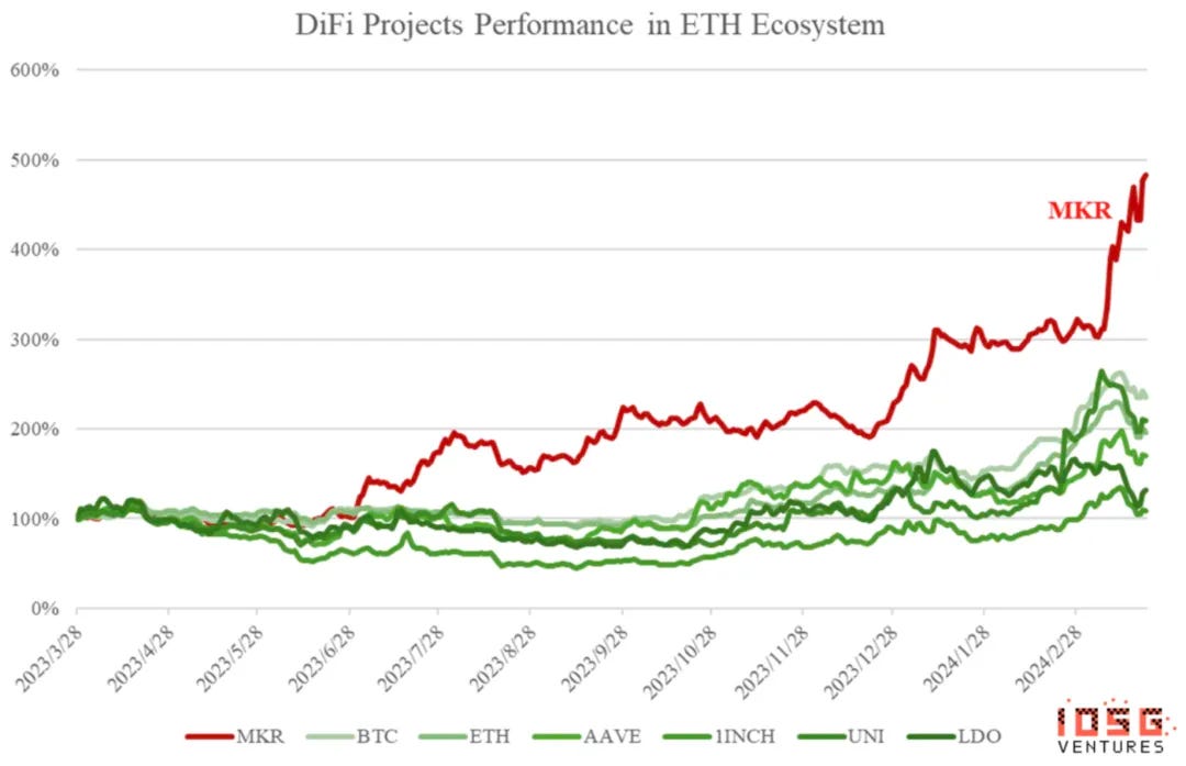 IOSG Ventures: 商业模式及盈利能力:1)通过锁定 stETH,MakerDAO 将这些资产有效地作为抵押物来铸造其本地稳定币 DAI。这一过程使 MakerDAO 能够通过对以 stETH 为抵押发放的贷款收取的稳定费用(利率)获得收入; 2)2023 年 6 月,MakerDAO 将美国国债整合到其投资组合中,这一举措意味着其正在通过利用 RWA 来使其收入来源多元化; 3)在高利率环境中,MKR 显示出强大的适应力,从其 RWA 投资中受益,这与其他可能在此类宏观经济压力下遭受损失的加密货币不同。当利率下降,市场流动性增加且加密市场进入牛市,MakerDAO 的策略预计将转向其在加密原生操作中的优势,特别是加密货币的借贷。