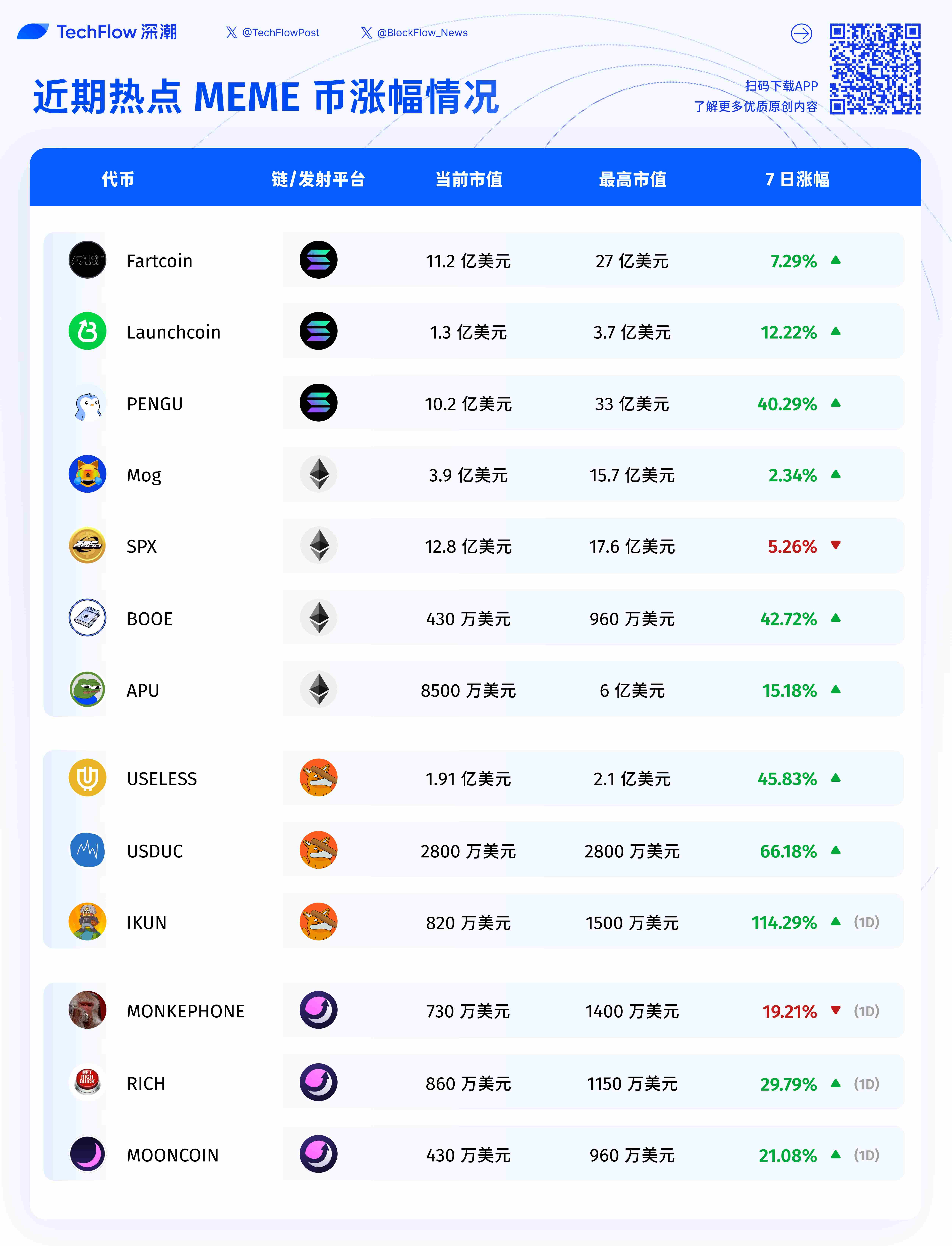 深潮 TechFlow:外有加密概念的股市狂吸流量,内有 BTC 自顾自地走独立行情,加密市场翘首以盼的「山寨季」行情好像仍在蓄势中,尚未真正回归。不过随着市场情绪复苏回暖,Meme 代币们开始久违地先行于市场。$USELESS 持续拉升带动 Meme 板块情绪复苏、ETH 系老 Meme 们集体反弹,或许短期内会迎来一波 Meme 代币反弹的行情。我们整理了部分最近币价走势尚可的 Meme 代币,助你了解市场最近的热点。注:Meme 代币价格波动剧烈,存在高度风险,投资者应充分评估风险,谨慎参与。本文仅根据市场热点进行信息搬运分享,作者及平台对文章内容的完整性、准确性不做任何担保,同时本文无任何投资建议。「老币」逢春。$Fartcoin (Fartcoin) —— Solana。作为去年现象级「无意义」 Memecoin 的龙头,Fartcoin 也在本轮行情率先反弹,当前市值 11.2 亿美元。24H 交易量:3300 万美元。最高市值:27 亿美元。$Launchcoin (Launch Coin on Believe) —— Solana。Believe 平台主币,本轮率先反弹,币价一路走高也许会带动 Believe 平台资产发行炒作热度。