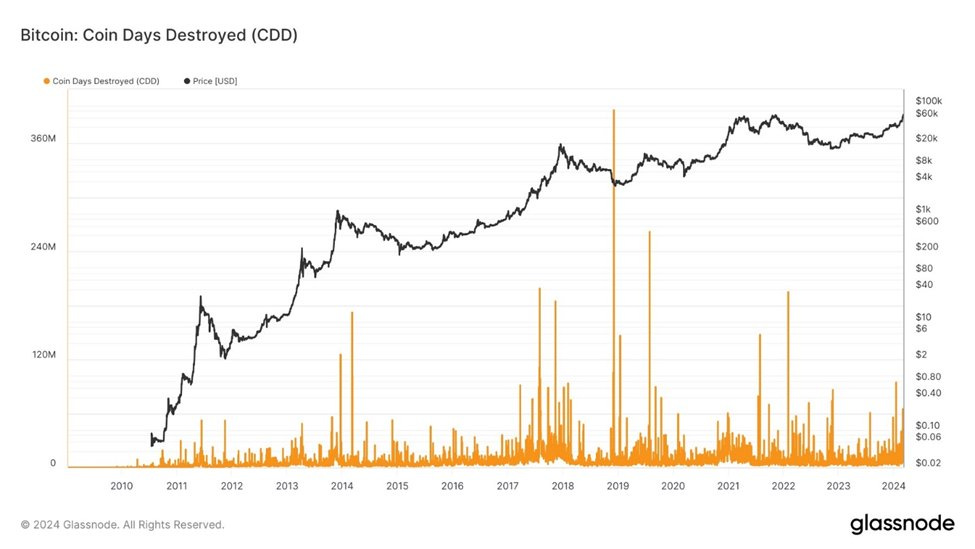事实上,如果我们看看 Coin Days Destroyed(CDD)指标,可以发现沉睡比特币的变动往往标志着牛市峰值或熊市底部。该指标获取一笔交易中的代币数量(或给定日期的所有交易),并将代币数量乘以自这些代币上次转账以来的天数。随着过去几周比特币价格走高,我们可以看到一些较高 CDD 数值。顺便说一句,其中一些峰值(例如 2022 年初的峰值)是由于特殊情况造成的(2022 年初的峰值是由于美国政府在 2 月 22 日早些时候从 Bitfinex 黑客手中没收了 36 亿美元的比特币)。当美联储扣押这些比特币并将其转移到他们控制的钱包中时,会对 CCD 指标造成干扰。话虽如此,我们并没有看到大量沉睡比特币涌入市场 —— 为了摆脱 OG,市场似乎需要走得更高。