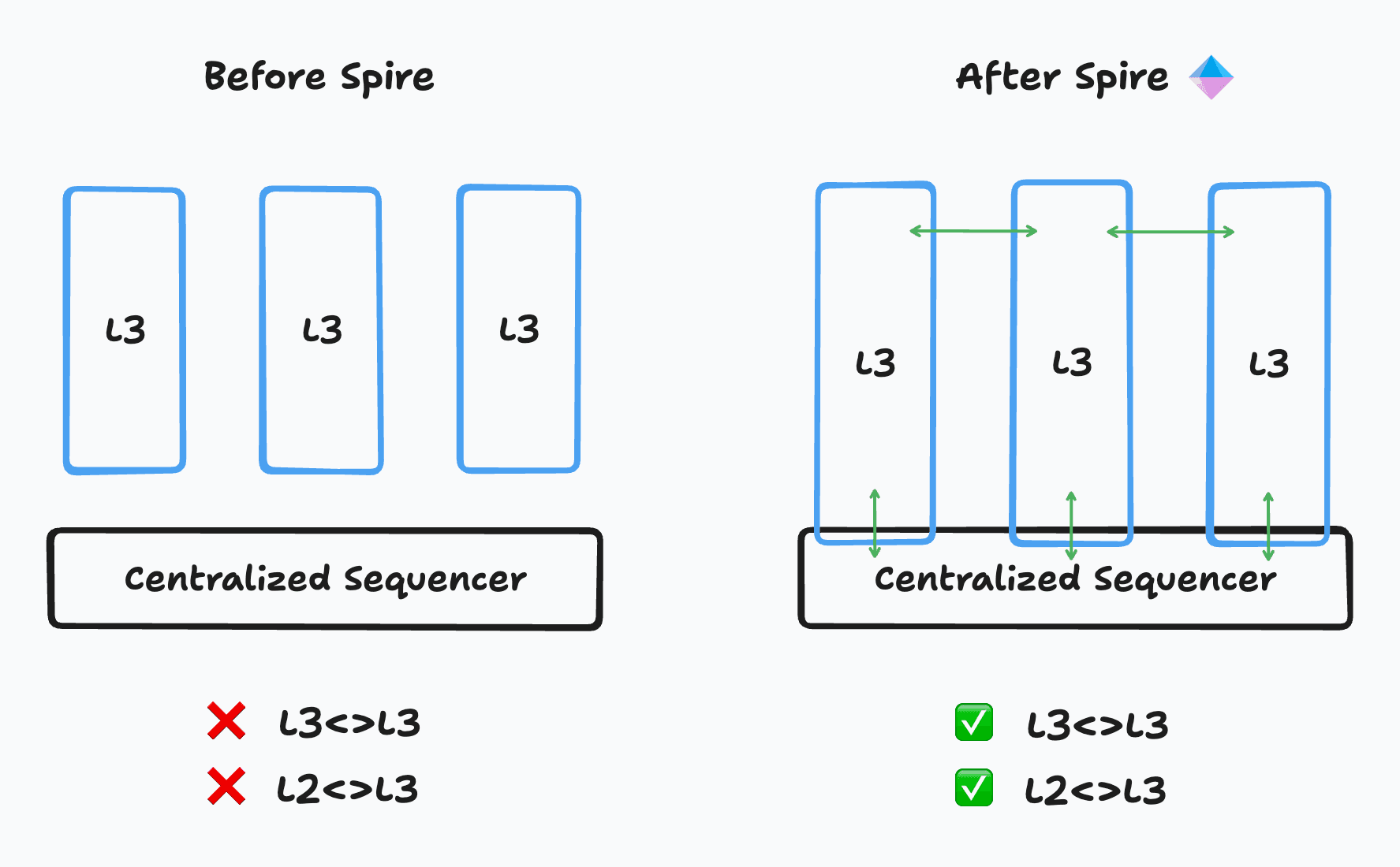 Spire:当前的 Rollup 架构创造了孤立的流动性岛屿,其中应用链独立运行,拥有各自的排序器和结算层。这种碎片化导致了:资本效率低 — 流动性池仅限于单个应用链,减少了资本的利用。执行延迟 — 跨 Rollup 的交易需要桥接或异步结算,带来延迟,降低了 DeFi 的可组合性。价格发现碎片化 — 不同 Rollup 上的市场缺乏同步,导致定价和执行效率低下。跨域执行风险 — 跨多个应用链的交易必须乐观地执行,增加了失败的可能性,丧失了原子性。这些低效性使得构建需要同步结算和跨多个链的原子执行的低延迟、高频应用变得具有挑战性。 Spire 通过引入共享结算和协调排序解决了这一问题,消除了流动性孤岛,实现了无缝的区块内可组合性。
