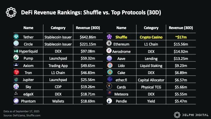 在收入模式与估值方面,Shuffle 相较于 Hyperliquid ($HYPE) 与 Pumpfun ($PUMP) 显示出独特优势。PUMP 与 HYPE 的收入几乎 100% 回流代币,但当前估值已反映其最大化捕获模式;而 Shuffle 目前仅分配 15% 的收入给代币持有者,意味着存在巨大的提升空间。按照现状,Shuffle 的市值与收入比(MC/Rev-to-holders)为 4.3 倍,FDV/Rev 为 12.1 倍,与 PUMP 相当,明显低于 HYPE 的 12.4 倍与 45.6 倍。如果收入分配比例提升至 25%、50% 甚至 100%,估值倍数将大幅下降,代币收益率有望超过 150%,几乎不可忽视。此外,Shuffle 的分红形式更具实用性:与单纯回购不同,USDC 分红为持有人带来可直接使用的现金流,价值更具确定性。2025 年 8 月,Shuffle 单月收入超 1700 万美元,超过同期以太坊(约 1560 万美元),在 DeFi 协议中排名第 11,展现了超常的现金流能力与再评级潜力。