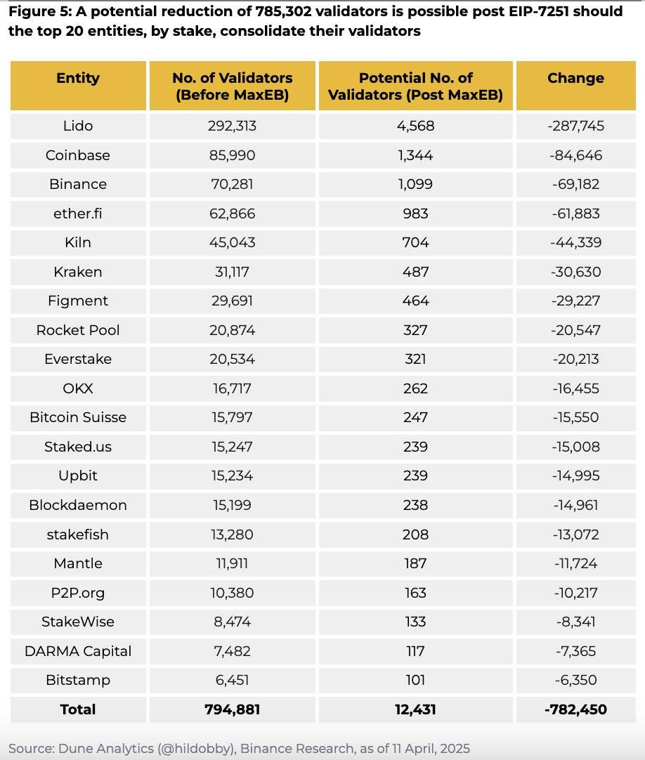 Binance Research:1)EIP-7251:目前验证者数量已超过 100 万,这对以太坊第一层(L1)网络造成了较大的压力。通过将最大有效余额上限提升至 2,048 ETH,大型质押服务提供商可以整合其验证者节点,而此前每个节点的质押金额上限为 32 ETH。