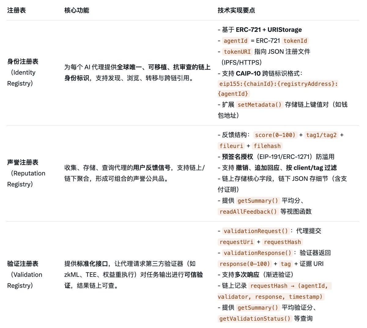 ERC-8004 是以太坊社区提出的一个 EIP 标准提案,全称为 Trustless Agents(无信任代理)。由 4 位作者在 8 月 13 日共同提出。ERC-8004 旨在解决 AI Agents 现存的「如何发现 + 信任」的问题,通过构建一个去中心化的系统让代理能被发现、被信任。具体技术实现上:ERC-8004 通过引入 3 个轻量级的链上注册表作为信任基础:Identity Registry (身份注册表)、Reputation Registry (声誉注册表) 和 Validation Registry (验证注册表)。基于 ERC-721 赋予每个 Agent 独一无二的身份,基于存储在链上的用户反馈信号赋予 Agent 声誉,基于第三方验证器(zkML、TEE、权益重执行等)对任务输出结果进行可信验证。即:ERC-8004 用「ERC-721 身份 + 链上反馈 + 可信验证」三板斧,构建了 AI 代理的「身份证 + 信用报告 + 公证处」基础设施,让陌生代理也能被安全发现、评估与信任。