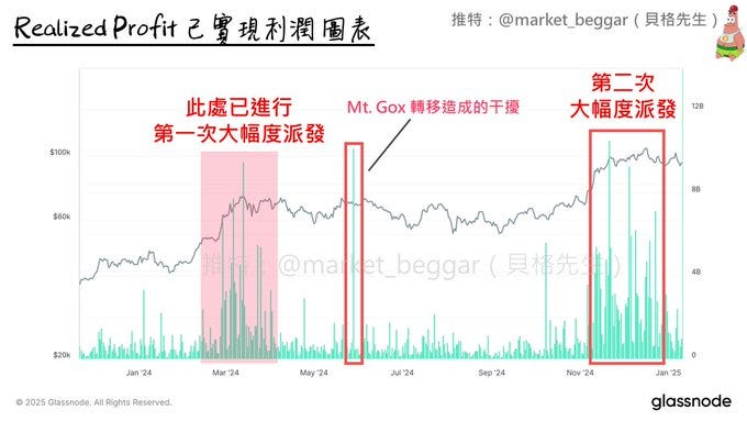 火星财经:在市场的高点,能够精准地判断出顶点并及时卖出,避免之后的损失,几乎是每个投资者的梦想。通过对市场数据的敏锐观察和深度分析,部分 KOL 成功地实现了这一点,准确识别出市场的过热迹象,并做出了相应的决策。例如,@market_beggar 早在 1 月 13 日便通过链上数据,如「已实现利润」(Realized Profit)、AVIV 热图、Cointime 价格偏离等指标,发出警告,提示市场已经处于过热状态。他的核心观点是,市场的顶端通常会经历两轮明显的「派发」阶段。每一轮牛市都会有大量投资者在低位悄悄积累筹码,而这些筹码的派发正是牛市逐渐走向终结的信号。当市场情绪达到极致,参与者普遍持有较高成本的筹码时,一旦价格无法继续上涨,卖盘就会逐渐涌现,最终引发价格下跌,形成熊市的开始。