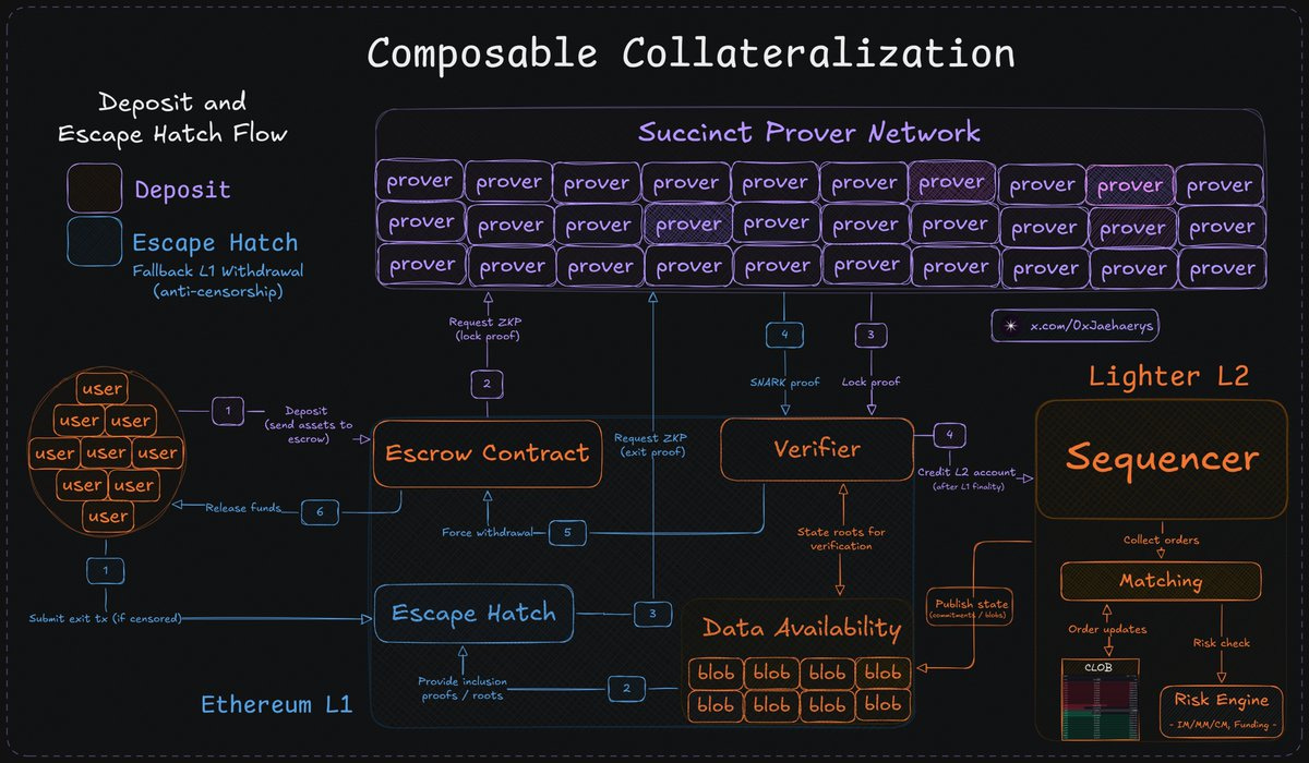 该架构的核心是 Escrow 合约与 Succinct 证明网络的协作。用户首先将 ETH、稳定币或生息资产存入以太坊 L1 的 Escrow 合约。Escrow 合约会触发事件,由 Succinct 证明网络接收并生成 SNARK 证明,证明资产确实已被锁定。验证合约在链上确认该证明后,Sequencer 才会在 Lighter L2 给用户的保证金账户入账。随后,L2 的状态承诺(订单簿状态、余额等)会被提交到数据可用层(DA)中,以便未来验证。整个流程中,资产从未离开 L1,安全性得到保证。更关键的是,当用户遭遇审查或 L2 出现问题时,可以通过逃生舱机制直接在 L1 提交退出请求。用户在 L1 上发起退出交易,DA 提供状态承诺与包含证明,Succinct 网络将该请求转化为证明任务并生成 SNARK 证明。若验证通过,Escrow 合约会强制释放资金,将资产直接返还用户。这一设计保证了无论 L2 出现何种情况,用户始终可以依靠 L1 的安全性取回资产。与传统 Rollup 的逃生路径类似,但在资产效用与抵押迁移的场景下,该模式提供了更灵活且抗审查的资金退出保障,进一步凸显了资本位置与功能分离的优势。【原文为英文】( 来源 )