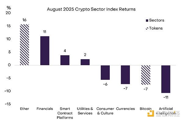 Grayscale:2025 年 8 月,加密货币总市值稳定在 4 万亿美元左右,但市场内部却出现了明显分化。比特币价格当月下跌,而以太坊却上涨 16%,并在月中创下接近 5000 美元的历史新高。这一表现主要得益于监管环境的变化。尤其是 7 月份美国通过了《GENIUS 法案》,为支付稳定币提供全面监管框架。作为稳定币的主要公链,以太坊因此在 7 月上涨近 50%,并延续至 8 月。根据 Grayscale 与富时罗素合作的「加密赛道」框架,8 月份货币、消费与文化以及 AI 赛道小幅下跌,其中 AI 赛道的疲软与美股市场相关股票走势一致。与此同时,金融、智能合约平台及公用事业与服务赛道则上涨。值得注意的是,8 月比特币虽然环比下跌,但曾短暂突破 12.5 万美元历史高点。监管动态方面,美国在稳定币之外的政策调整同样密集,从加密托管到银行监管都有涉及。特朗普政府和联邦机构的行动为市场带来更多清晰度,推动了机构投资热潮。8 月,美联储理事沃勒和鲍曼首次出席区块链会议,强调监管需在金融稳定与创新空间间找到平衡。9 月,参议院银行委员会计划审议基于 CLARITY Act 的市场结构立法,业界则关注其能否保护开源开发者与非托管服务商。