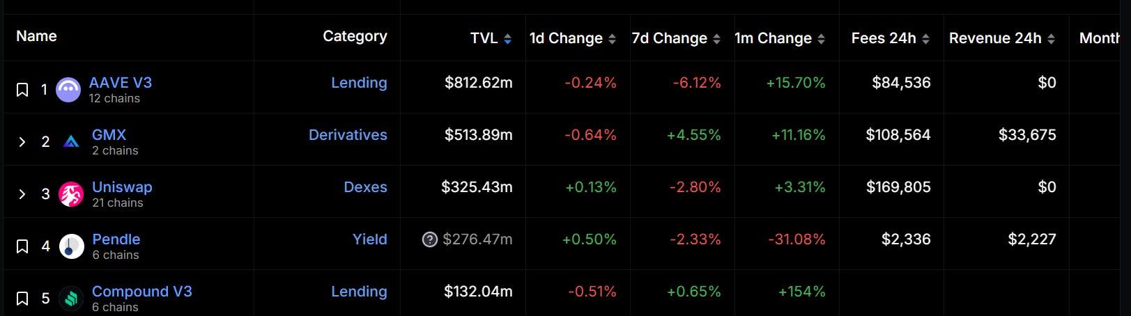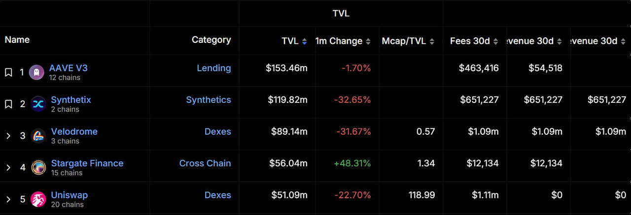 Optimsim 总锁仓量目前排名第三,其在 2024 年 3 月 10 日达到上半年历史高点,随后略有回落,但整体较为平稳,最终于 6 月被 Base 反超。据 DeFiLlama 数据显示,Optimism 生态 TVL 排名前三的项目分别为 AAVE v3、Synthetix 及 Velodrome。但在过去一个月内,这些项目的 TVL 都呈现下降趋势。