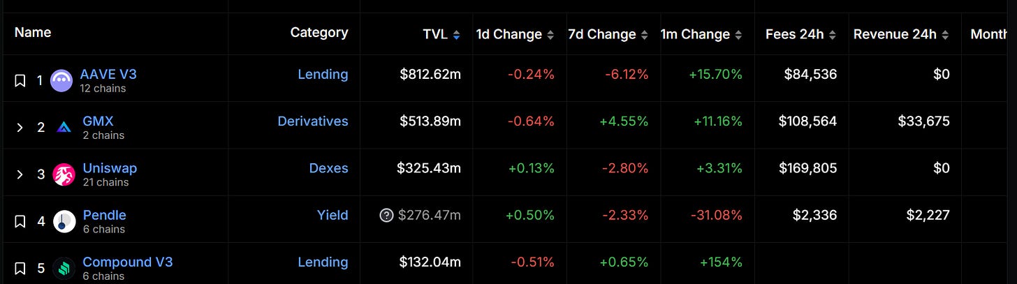 自 2024 年初以来,Arbitrum 总锁仓价值一直保持在领先水平。截至 7 月 28 日,Arbitrum 的 TVL 达到约 171.5 亿美元,稳居第一,占据约 40% 的市场份额,远超排名第二的 Base 2.4 倍多。据 DeFiLlama 数据,Arbitrum 上总锁仓价值最高的项目是 AAVE,锁仓价值为 8.1262 亿美元,其次是 GMX 和 Uniswap,分别为 5.1389 亿美元和 3.2543 亿美元。