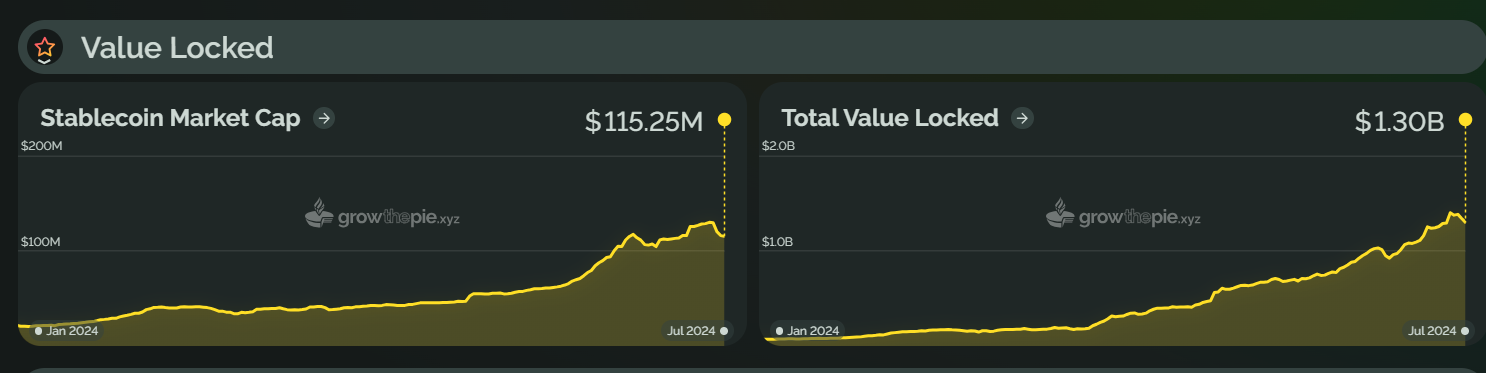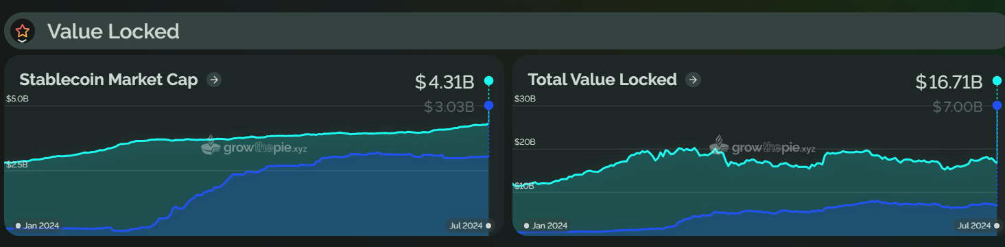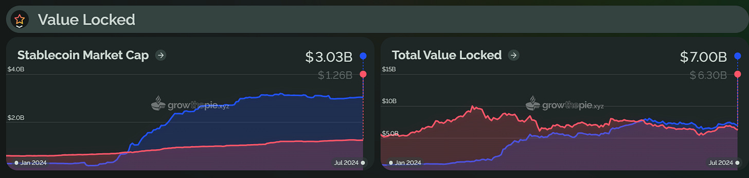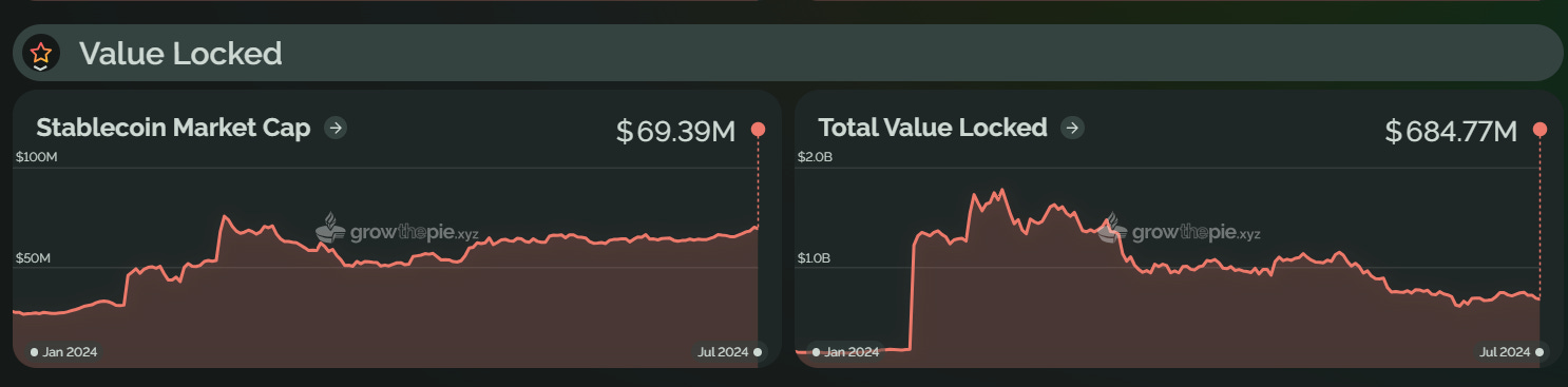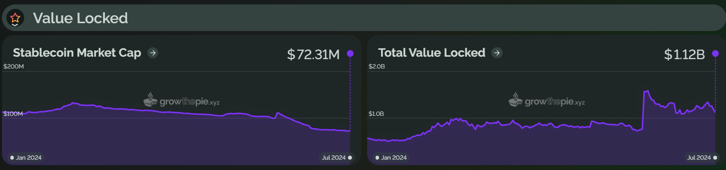 作为后起之秀,自 2024 年初以来,Base 一直保持着上涨趋势,并在 6 月赶超 Optimism,成为第二大 Layer2 。目前,Base 总锁仓价值约为 70 亿美元,较年初上涨约 716%。从下图可以看出,Base 在 3 月出现了一次明显的 TVL 增长,可能是由于 Farcaster 的持续增长、坎昆升级后 Gas 费用的降低以及 MEME 代币的流行,导致链上流动性大幅增加,推动了 TVL 的增长。不过,目前 Base 的 TVL 略有回落,较 6 月份下降了约 6.6%。
