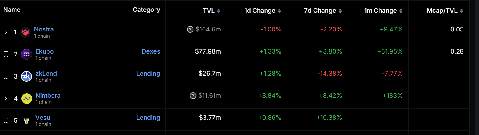 在生态进展方面,Starknet 生态目前已经集成了超过 100 个应用。Starknet 上总锁仓价值排名前五的项目均为 Starknet 原生项目。排名第一的是借贷协议 Nostra,锁仓价值为 1.646 亿美元;排名第二的是去中心化交易所 Ekubo,过去一个月 TVL 增长了 61.95%。目前为 7798 万美元;排名第三的是借贷协议 zkLend,TVL 为 2670 万美元。不过,Starknet 生态中超过千万美元 TVL 的项目仅有四个,排名第五的借贷协议 Vesu TVL 仅为 377 万美元。