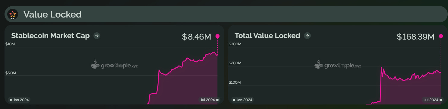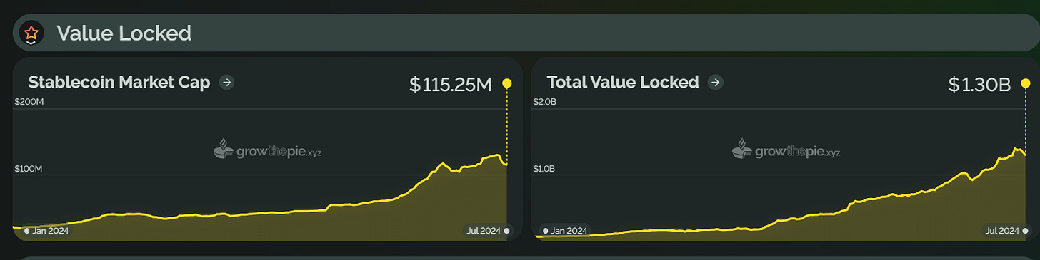 类似地,2024 年上半年,Starknet 总锁仓价值在 2 月 20 日开始显著上升,并在 3 月 14 日达到了历史新高,为 17.76 亿美元。这一增长主要受到 STRK 代币空投计划和 Starknet 基金会推出的「Starknet 春季 DeFi 激励计划」的推动。然而,截至目前,Starknet 的 TVL 已回落至约 6.85 亿美元,较巅峰值下降了约 61%。