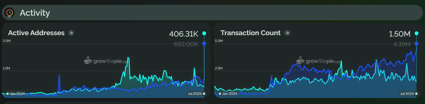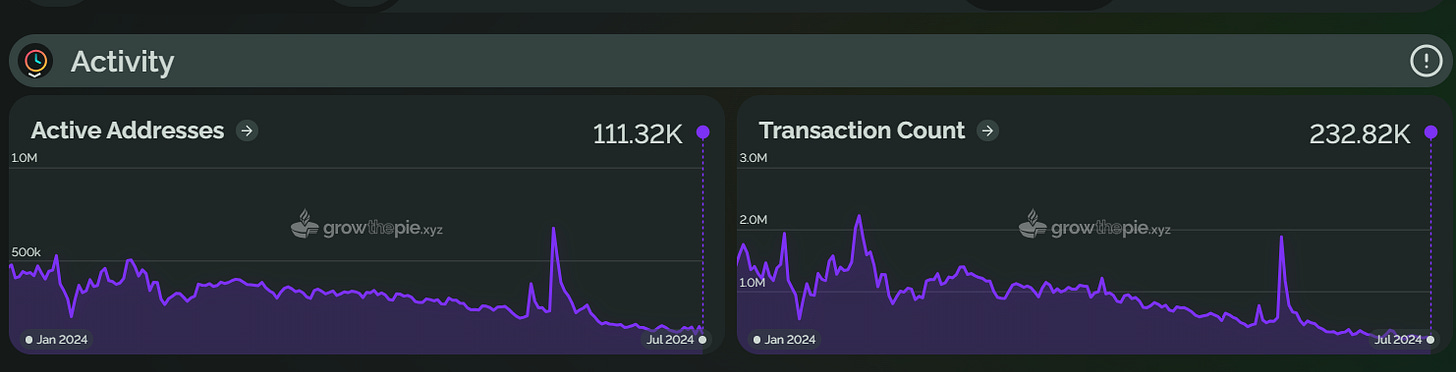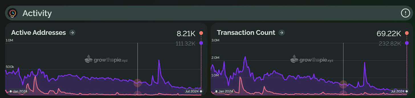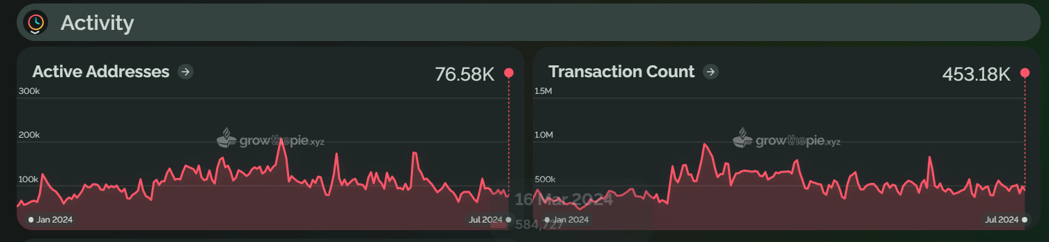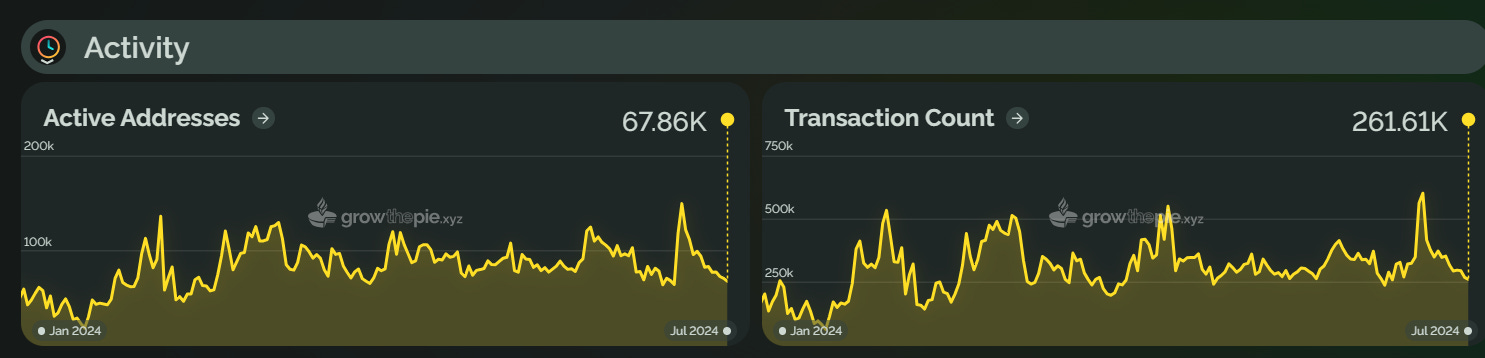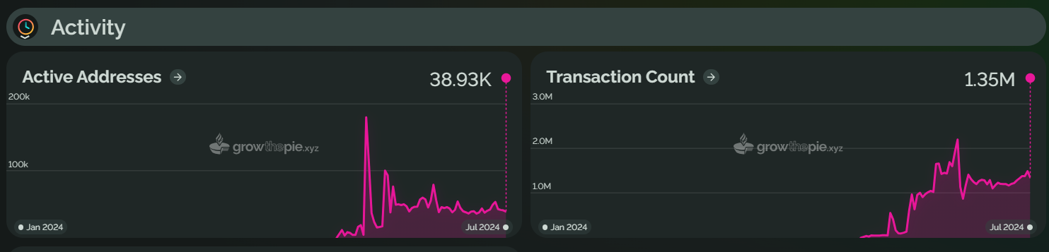 Taiko 于 2024 年 5 月上线主网,其 TVL 在 6 月 5 日达到了 1.9 亿美元的历史高点,但随后回落至 1.6345 亿美元。活跃地址数量在 6 月峰值后下降了 78.3%。