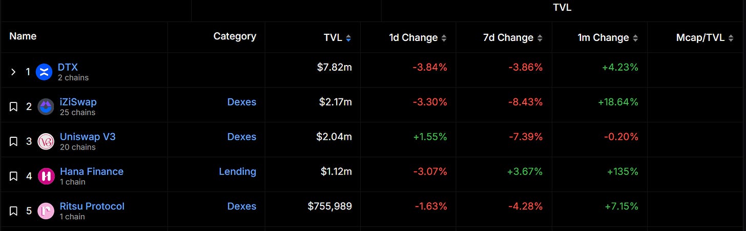 据 DeFiLlama 数据显示,Taiko 目前总锁仓价值排名前三的项目分别为去中心化永续交易平台 DTX、iZUMi Finance 旗下多链 DEX 平台 iZiSwap 及 Uniswap V3。总体来看,Taiko 生态项目 TVL 均不高,且 DTX 占据了较为显著的市场份额。