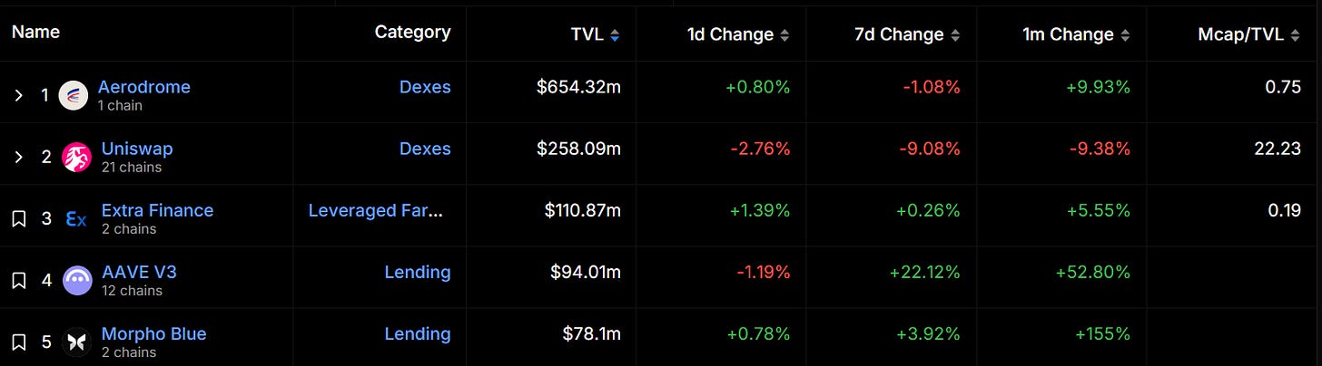 据 DefiLlama 数据,目前 Base 上 DeFi TVL 为 16.7 亿美元,其中原生 DeFi 项目占据主导地位,包括 Aerodrome(6.54 亿美元)和 Extra Finance(1.1 亿美元)。Aerodrome 是 Base 链上目前总锁仓价值最高的 dApp,领先排名第二的 Uniswap 一倍以上。