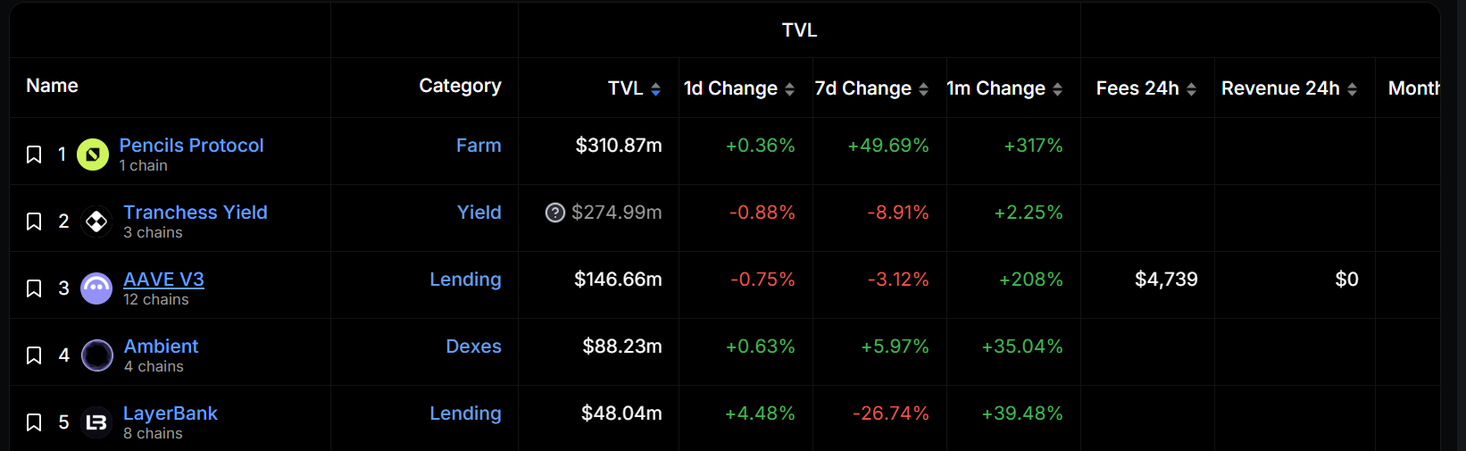 据 DeFiLlama 数据,Scroll 上总锁仓价值排名第一的项目是其生态原生项目 Pencils Protocol,锁仓价值为 3.1087 亿美元,过去一个月涨幅为 317%。值得注意的是,Scroll DeFi 总锁仓价值为 7.6902 亿美元,而其生态中排名前三的项目的总锁仓价值占据了超过 95% 的市场份额。
