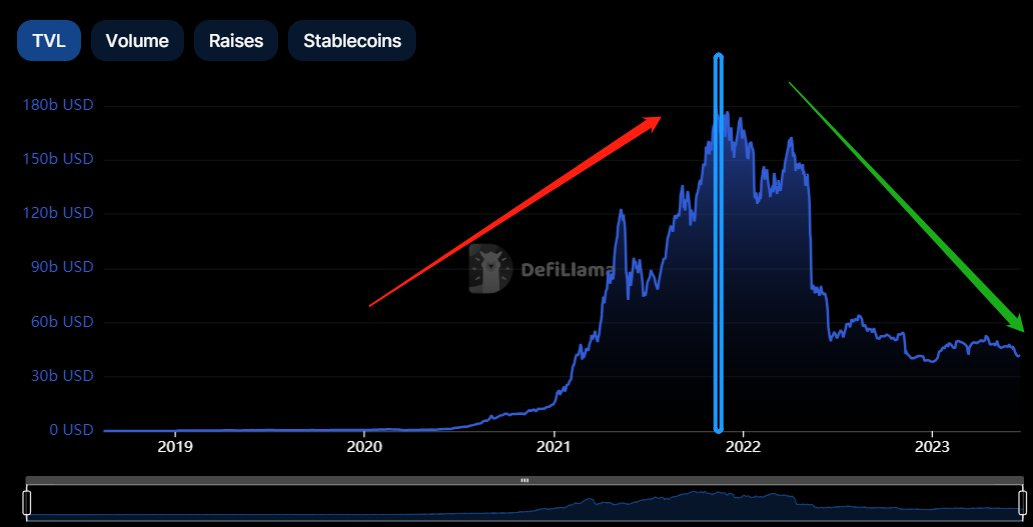 NingNing: 综观 DefiLlama 统计的链上 TVL 曲线,减量发展时期,链上 TVL 从 1749.1 亿美元下降至 421.2 亿美元。造成链上 TVL 进入减量发展时期的主要原因有:1)美联储的史诗级货币紧缩周期。2)链上金融炼金术泡沫破裂。美联储激进的加息力度,致使创造 TVL 两大利器的算法稳定币、CeFi 借贷的泡沫快速破裂。3)美国三大加密友好银行破产关闭。在 23 年 3 月的美国银行危机中,美国三大加密友好银行 SilverGate、硅谷银行、签名银行全部破产关闭,美国普通机构和散户基本丧失入金通道。