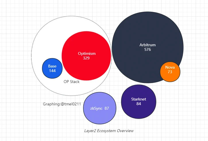 Haotian: 1)Arbitrum 既有生态最为壮大,One+Nova 协议数量高达 598 个。在 layer2 中 Arbitrum 的生态最为稳固。而且,最近 Arbitrum 推出了 Stylus 神器,不少开发者反馈这会进一步刺激 Arbitrum Orbit 生态的扩张。因为 Stylus 的 WASM 解析器允许开发者使用 Solidity、Rust、C、C++ 等多种语言编写智能合约,WASM 会以近乎原生的编译执行速度,执行这些合约,还能降低 Gas 消耗。短期 Arbitrum 有被 OP 超越的可能性,但一旦 layer3 生态起来,很快也会扭转战局。