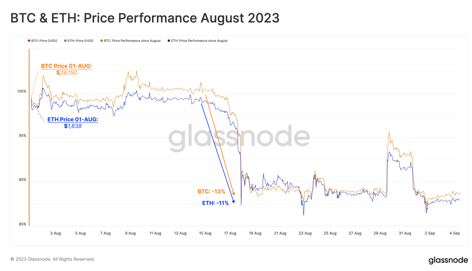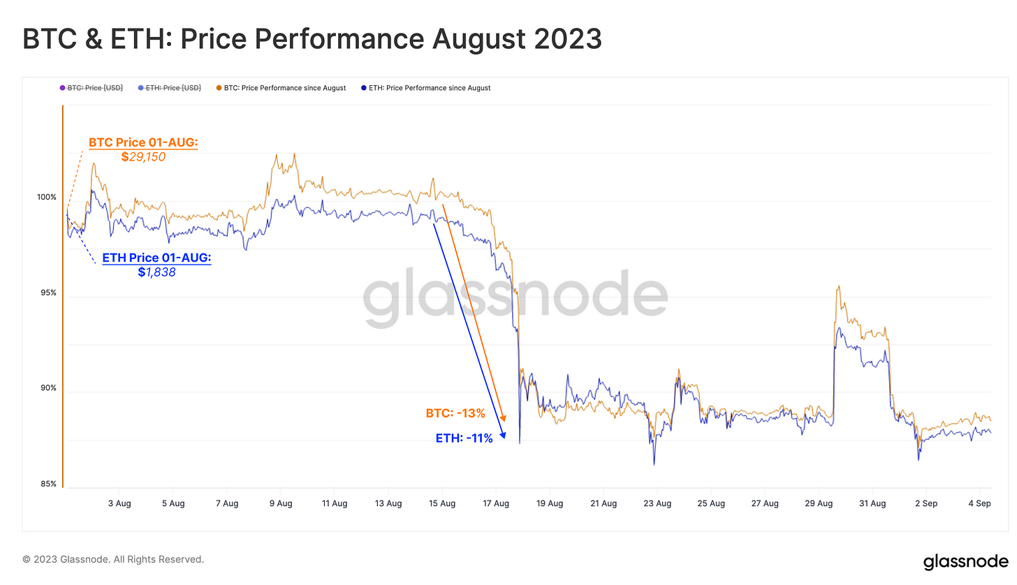 glassnode: 8 月 17 日的闪崩事件导致比特币和以太坊分别下跌了 11% 和 13%。Greyscale 在 8 月 29 日取得对美国证券交易委员会(SEC)的法律胜利的消息曾使价格短暂上涨,然而在接下来的三天内,所有涨幅都被抹去。目前,BTC 和 ETH 的现货价格都停滞在 8 月的低点附近。市场在 8 月初就已进入了资本外流的阶段,远早于这两个重大事件。8 月约有 550 亿美元的资本离开了数字资产领域。这一趋势是由比特币、以太坊和稳定币这三种资产的资本外流所推动的。