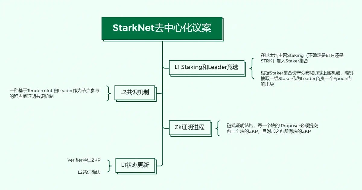为解决这个问题,「简单去中心化协议」给出如下方案:1)L1 Staking 和 Leader 竞选,社区成员可以无许可地在以太坊主网 Staking(不确定是 ETH 还是 STRK),以加入 Staker 集合,根据 Staker 集合资产分布和 L1 链上随机数,随机抽取一组 Staker 作为 Leader 负责一个 Epoch 内的出块;2)L2 共识机制,StarkNet L2 的共识机制,是一种基于 Tendermint 的、由 Leader 作为节点参与的拜占庭证明共识机制,共识确认之后,由 Voter(参与 P2P、验证和投票)执行,由 Proposer(构建区块)调用 Prover 生成 ZKP。