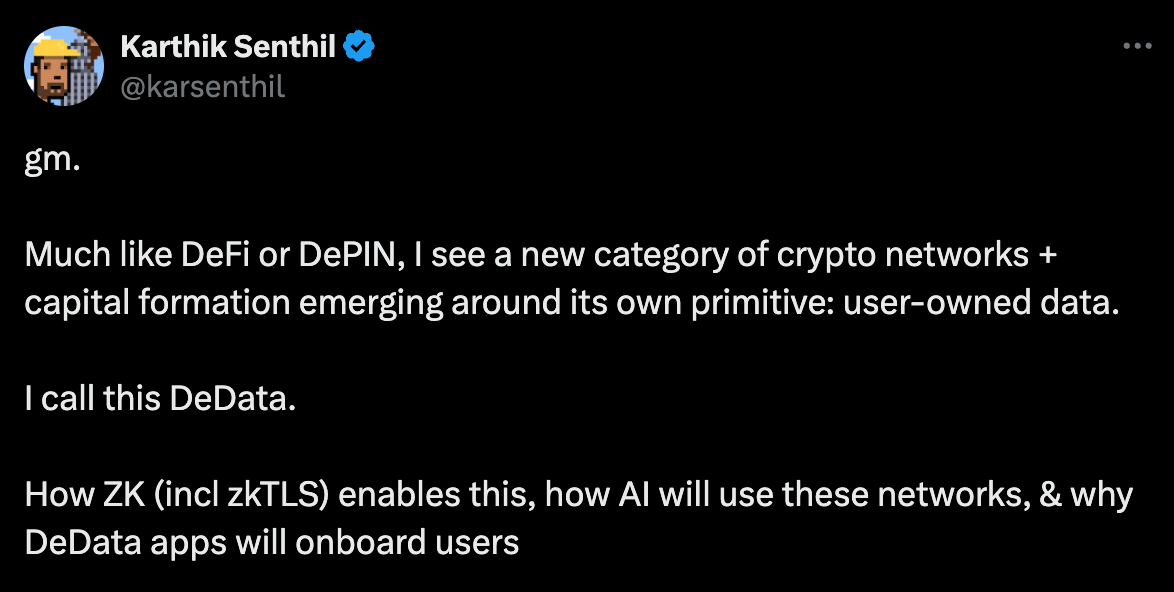 导读:ZKsync 团队 Karthik Senthil 提出了一个新兴的加密网络概念 ——DeData(去中心化数据),结合零知识证明(ZK)、zkTLS 和自主 AI 代理,探索用户数据所有权与价值捕获的新模式。