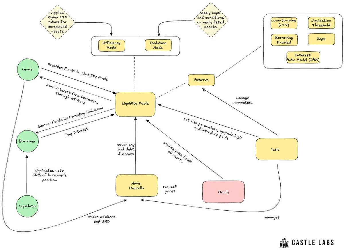 Aave 的 Umbrella 系统(前身为 Safety Module)为协议提供关键安全保障。用户可质押 aToken 或 GHO 获取奖励,同时在坏账发生时充当补偿来源;若出现资不抵债的情况,质押资产可被削减以覆盖损失。DAO 已承诺提供 10 万美元的初始坏账保障,形成有效的保险层。清算机制同样是 Aave 韧性的核心:系统以健康因子(HF)追踪每个借贷头寸,若 HF 低于 1,则会触发清算,清算人可偿还最多 50% 的债务并以折价获得抵押品,从而保持协议偿付能力。Aave v4(已上线测试网)旨在解决资本碎片化,并进一步重构协议为模块化借贷基础设施。其核心是 Liquidity Hub,将 Prime 与 Core 的流动性聚合,使资金可动态流动,提高效率。Spokes 机制允许独立市场实例按照自身参数运行,如支持长尾资产、设置供应与借贷上限,同时受 Hub 的系统规则约束。与此同时,Aave 新推出的 App 可帮助零售用户获得最高 6.5% 的年化收益,并提供最高 100 万美元的余额保护。应用还支持 on/off ramp 服务,使更多新用户顺利进入 DeFi。随着 v4 的模块化设计、Horizon 的 RWA 推进,以及强大的流动性壁垒,Aave 持续巩固其「链上银行」的地位。【原文为英文】( 来源)