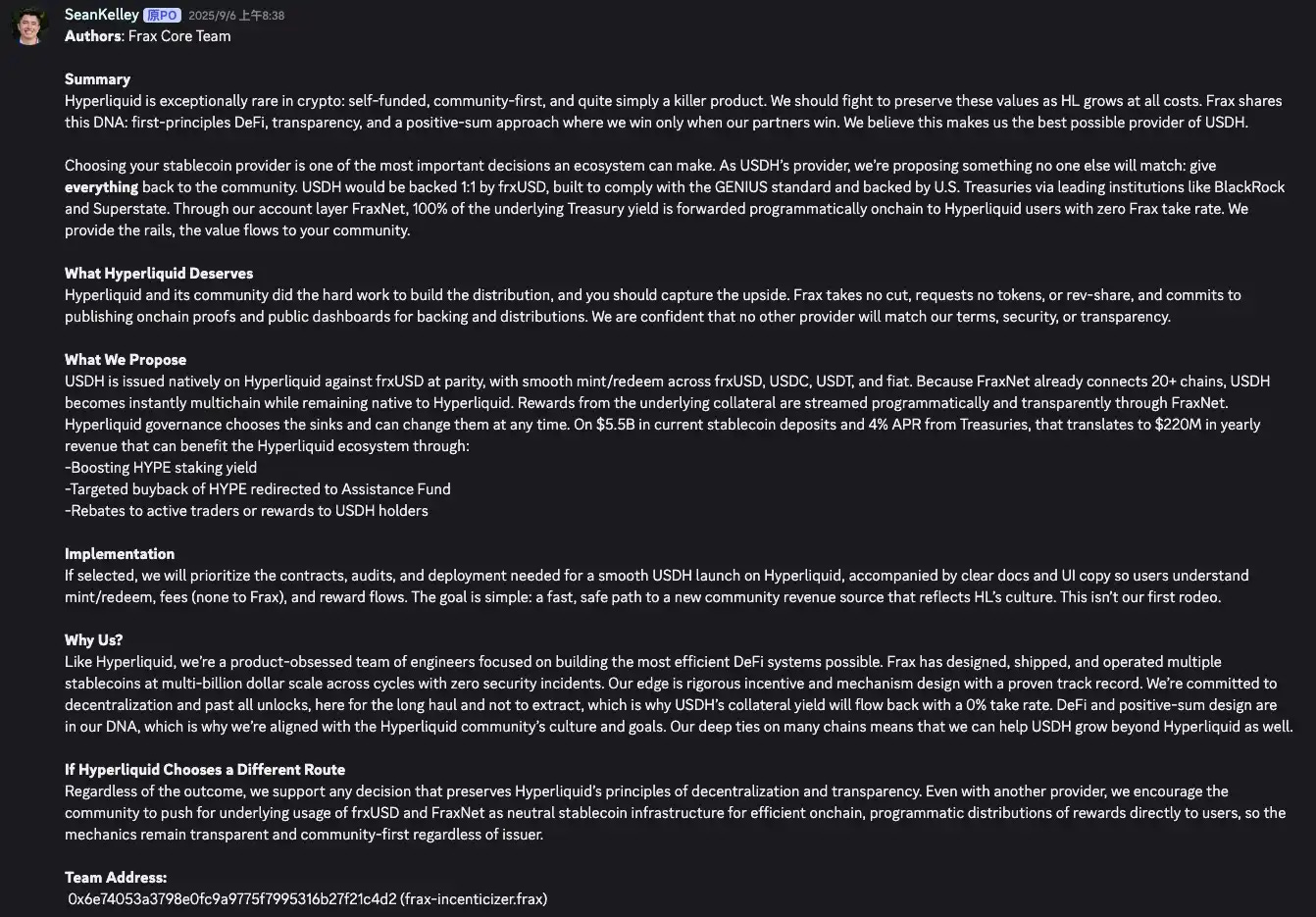 BlockBeats:近日,在去中心化衍生品交易平台 Hyperliquid 上,一场围绕原生稳定币 USDH 发行权的争夺战正式打响。9 月 5 日,官方宣布开放 USDH 的 Ticker 拍卖,截止 9 月 10 日已有 Paxos、Frax、Agora、Native Markets、Ethena 等多方提交提案,竞逐成为 USDH 的发行方。这场竞标之所以引发高关注,源于 Hyperliquid 的迅猛崛起:其永续合约月度交易量接近 4,000 亿美元,8 月单月手续费收入高达 1.06 亿美元,占据去中心化永续市场约 70% 份额。目前链上美元流动性主要依赖 USDC,存量规模约 57 亿美元,约占 USDC 总发行量的 7.8%。若转换为原生稳定币,每年利息收益或达数亿美元,这意味着巨大的价值空间。Hyperliquid 团队曾考虑自行发行 USDH,但最终决定通过公开竞标方式「下放」发行权,转向社区治理与多方博弈。官方表示将坚持「Hyperliquid-first, Hyperliquid-aligned」原则,即优先选择能最大化回馈社区、强化 HYPE 代币价值的方案。官方基金会虽持有大量 HYPE,但承诺不动用投票权,最终结果将在 9 月 14 日社区投票中决定。这一转变不仅是对中心化质疑的回应,也标志着 Hyperliquid 治理走向更开放的尝试。