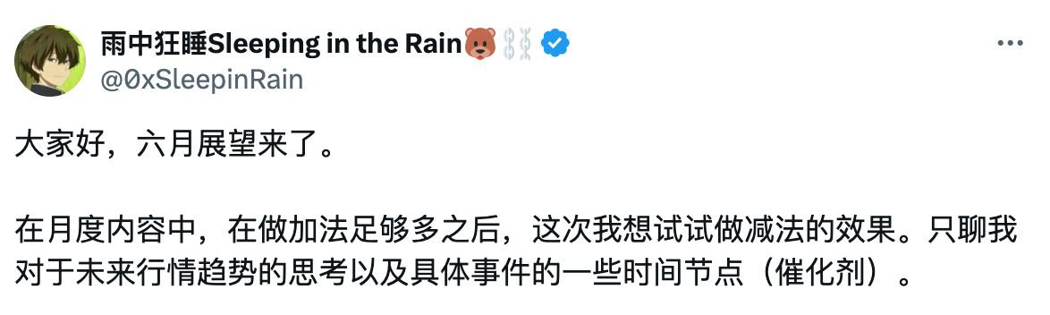 导读:加密货币 KOL 雨中狂睡分享其对于未来行情趋势的思考,以及具体事件的一些时间节点(催化剂),并梳理其对如何选择投资标的的一些个人想法。