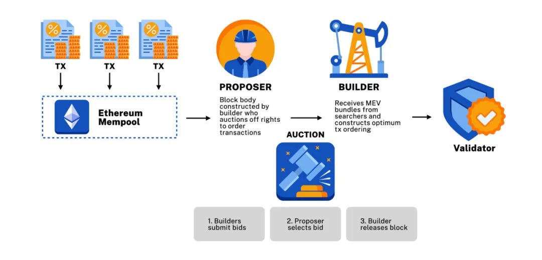 Uncommons: 截止目前,PBS 暂时没有特定的实现形式。本质上它是一种设计理念,其核心是强调公平和去中心化。PBS 中出块者验证投票的角色被拆分为两个子角色:Builder:负责区块打包,通过选择包含哪些交易并确定其顺序来创建区块;Proposer:负责交易排序,采用构建者创建的最佳区块并将其添加到区块链中。作为去中心化验证解决方案,PBS 可以防止 Builder 中心化对区块验证或质押奖励分配造成的影响。
