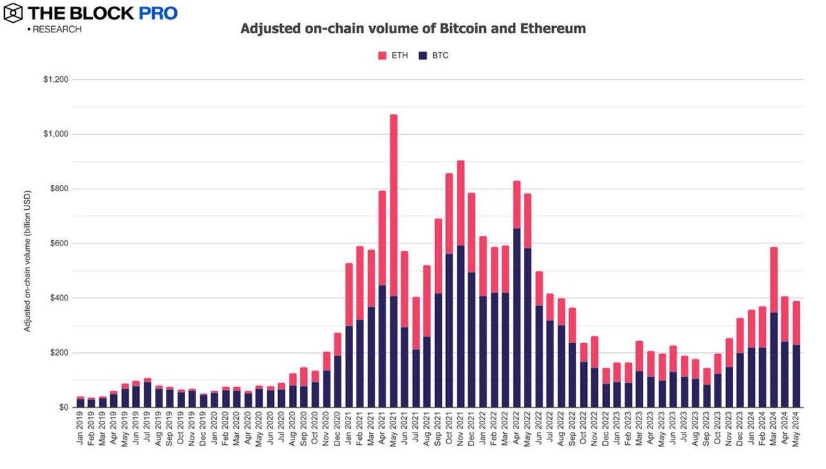 Lars: 1. 五月,比特币和以太坊调整后链上总交易额整体下跌 4.4%,降至 3900 亿美元,其中比特币调整后链上交易额下跌 4.7%,以太坊链上交易额跌幅达到 3.9%。