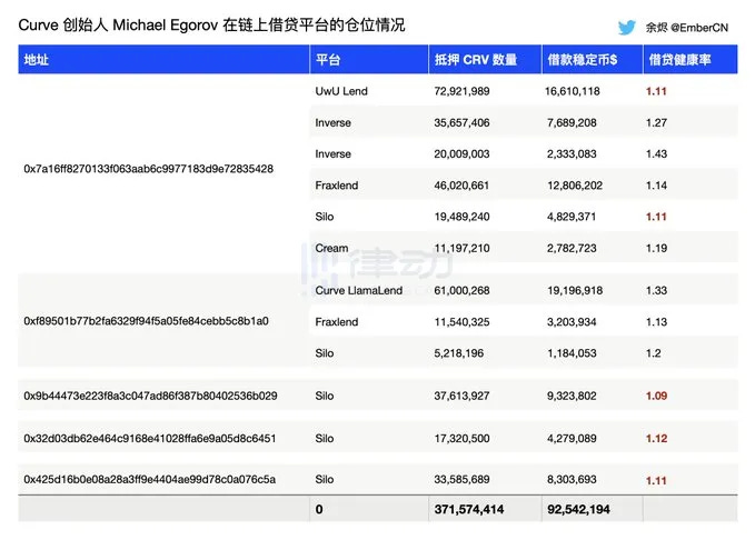 BlockBeats: CRV 的危机早在 2 个月前就初见端倪,当时 Michael 的借贷仓位就已跌破清算阈值,但彼时的 Michael 并未被清算,也不见 Michael 有任何补救行为。4 月 14 日,随着市场下跌,CRV 价格也受影响跌至 0.42 美元,Curve 创始人 Michael Egorov 的借贷仓位又进入了红线。据余烬监测,Michael 通过 5 个地址在 6 个借贷平台共计抵押了 3.71 亿枚 CRV,并借出 9254 万美元的稳定币。在 12 笔债务中,以 silo 借贷仓位最危险。4 月 14 日中午,CRV 价格跌至 0.42 美元,据 debank 数据,Michael 的 12 个仓位中,5 个仓位健康值已达 1.12 甚至更低。余烬监测到 Michael 债仓红线,并发推文做出清算推测,他指出若 CRV 价格如若继续下跌 10% 而没有补仓或还款的情况下,将启动清算程序。然而,正当人们思考 CRV 该如何应对第三次「DeFi 保卫战」时,有趣的事发生了。人们注意到,当日凌晨 4 时,CRV 价格一度跌到 0.3592 美元,早已跌破 0.42 美元的 10%。但 Michael 债仓并没有如余烬所说被清算,甚至 Michael 本人似乎也没有做出任何补救措施。