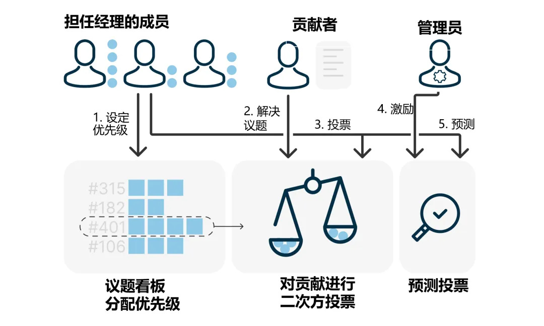 Leon Erichsen: 多元管理协议生态系统中有三种角色:工人(Workers),他们为组织做出直接贡献;经理(Managers),他们确定什么工作是重要的以及一项工作的质量是否合格;管理员(Administrators),他们可以决定系统属性以影响行为。与其为每个人分配一组等级化角色,这种组织中的所有人都拥有一套该组织的管理积分(Management credits)。这些积分允许个人在决策中行使权限,并因所做的贡献获得认可。个人可以作为工人角色,以贡献(Contribution)的形式提供解决议题的方案。如果贡献被接受,工人将获得与优先级设置中分配的总积分成比例的积分。一旦贡献产生,将进入贡献投票(Contribution vote)。个人可以花费管理积分来投票决定该贡献是否应该被批准。如果投票通过,工人将获得奖励;如果不通过,议题回到板上(经理可以增加优先级,以提供更高赏金)。这种投票采用二次方机制,确保了拥有不同积分数量的个人之间产生均衡的影响。