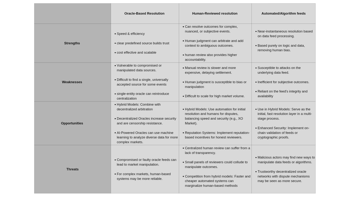 baheet:预测市场的概念早在区块链出现之前就已存在,但真正走向主流是随着 Polymarket 的出现。自 2020 年上线以来,Polymarket 将链上去中心化基础设施与便捷用户体验结合,吸引了大量交易量,尤其在美国大选等重大事件中脱颖而出,成为分散式预测市场潜力的最佳证明,也推动了新一轮竞争与创新。不同平台在设计上差异巨大,最核心的首先是「结果裁决机制」(Outcome Resolution)。预测市场必须解决如何验证并结算市场结果的问题,平台通常采取三种方式:依赖外部预言机、人工裁决或算法自动化。以 Polymarket 为例,它采用 UMA 提供的乐观预言机进行仲裁与争议解决;Myriad 和 Limitless 依托 Chainlink 或 Pyth 等价格预言机来处理价格市场;OpinionLabs 也在尝试使用去中心化预言机网络来完成结果获取。另一类是人工裁决,比如 Kalshi 在 CFTC 监管下设有专门团队审查市场结果,Augur 则采用社区报告员机制,XO Market 甚至设计了 AI 与人工陪审团结合的混合仲裁模式。最后是自动化算法流派,如 Kalshi 基于官方指定的数据源自动结算,Polymarket 与 Limitless 也使用集成预言机数据实现快速结算。自动化强调效率,人工审查强调灵活性与合规,而混合方式则试图平衡速度与可信度。
