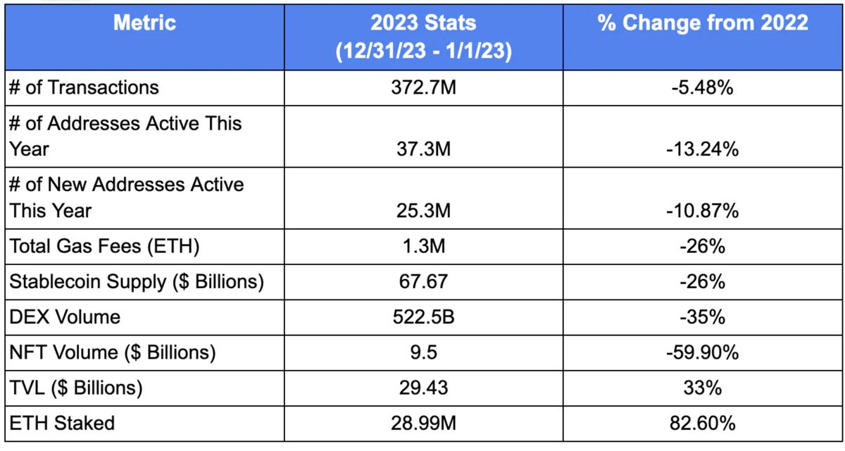 导读:Variant 成员 J.Hackworth 撰文分享了对 2023 年链上数据的深入分析,大多数以太坊指标相较于 2022 年下降,TVL 出现了增长,Layer 2 的采用也在持续增加。