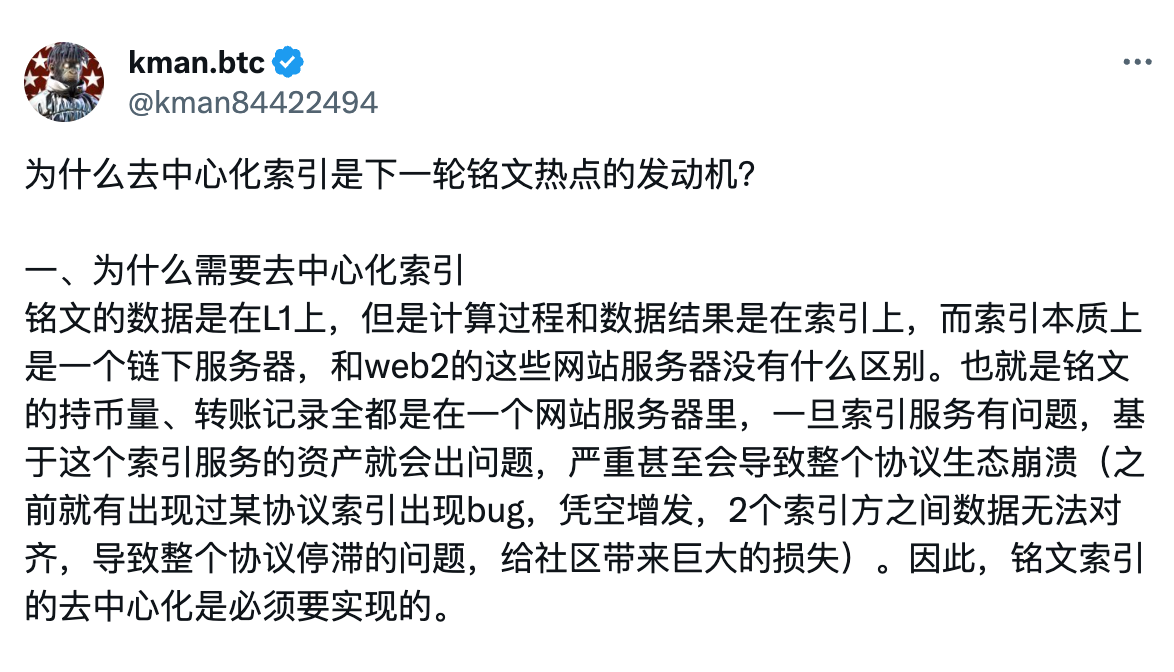 导读:铭文的数据是在 L1 上,但是计算过程和数据结果是在索引上,一旦索引服务有问题,基于这个索引服务的资产就会出问题,严重甚至会导致整个协议生态崩溃。加密研究员 kman.btc 撰文梳理了现有索引去中心化状况及优缺点,并对去中心化索引实现后对协议之间的影响进行了展望。