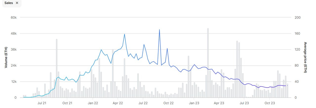 2)NFT—— 除了 PFP,它还可以是什么?传统的 PFP 的故事已经很难让大家买单了。下图是 BAYC 的最近一两年的价格走向。在 2022 年 Yugalabs 还推出了 APE+ 猴地的组合拳,让市场 fomo 一时。但是今年的 NFT 市场非常冷清,大户已经很难再来为 NFT 支付几万几十万美金。此外 Azuki 也让市场再寒心一波,今年推出的 AZuki Elemental 等也相当于直接复制粘贴一键生成就开始印钱,很难感受到团队的走心。