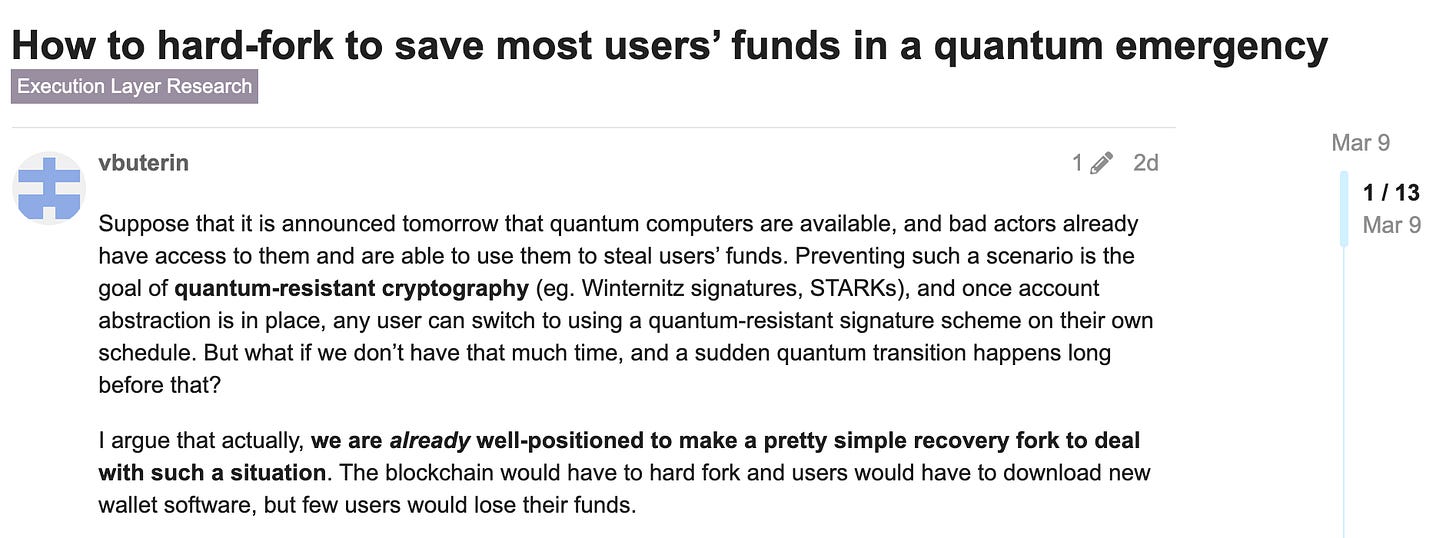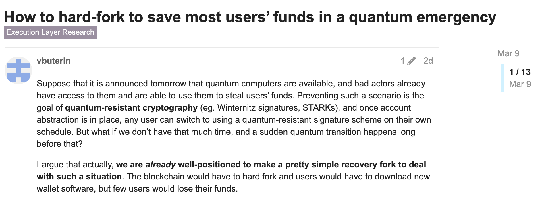 原则上,明天我们就可以开始对实现此恢复性分叉所需的基础设施进行开发,从而使以太坊生态系统能够在突发的量子攻击中做好准备。( 来源 )