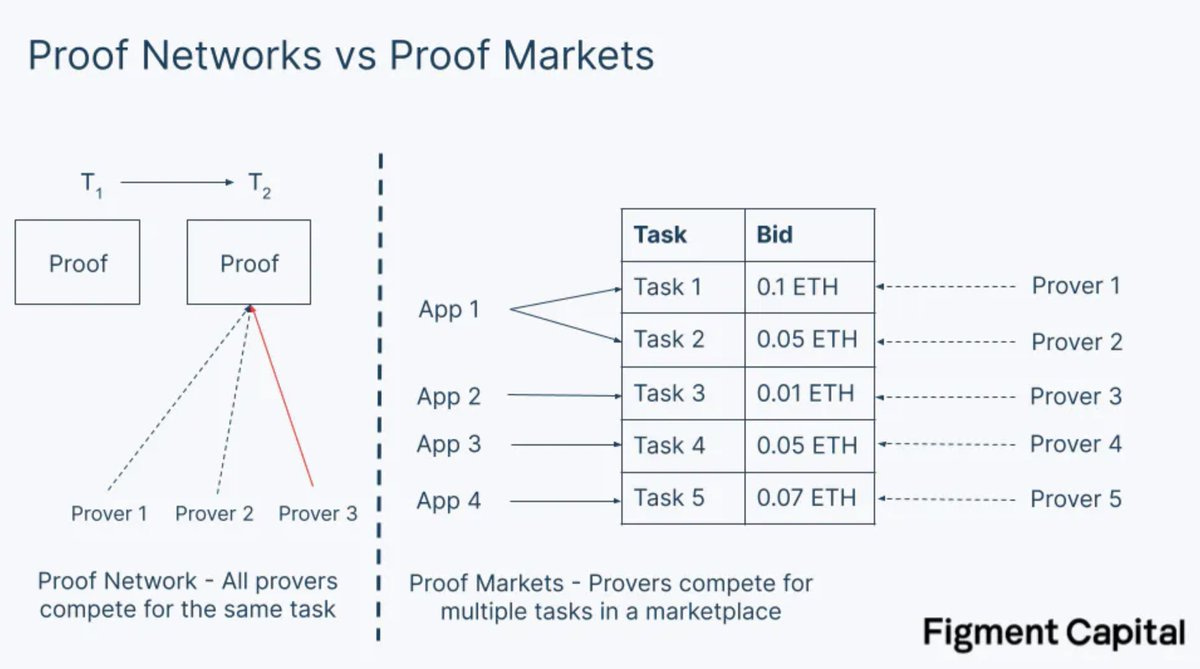 证明市场是 P2P 市场,其中交易的商品是 ZKP。ZK 应用程序可以提出证明请求,证明者在另一方参与并竞争生成这些证明,证明的定价由供需动态决定。虽然协议通过外包证明放弃控制,但他们可以使用其原生代币在更大的市场中培育子市场。由于大多数协议对证明都有持续需求,子市场将允许他们根据预算和要求灵活地管理网络规模,而不必持续为固定节点大小的网络付费。对于有持续需求的大型协议来说,孤立的证明者网络也许是可行的。但对于大多数其他应用来说,证明市场的证明即服务模式才是实用方法。【原文为英文】( 来源 )
