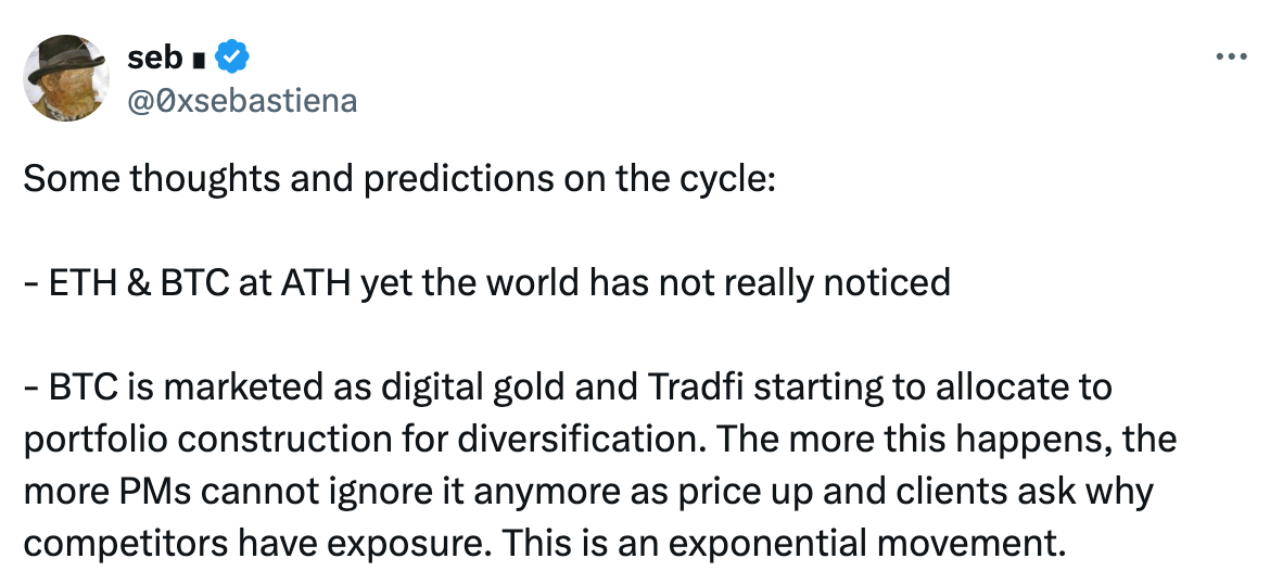 导读:近日,zkSync 增长主管 @0xsebastiena 分享有关本轮牛市的一些看法和预测,加密研究员 gm365 对其进行整理编译。