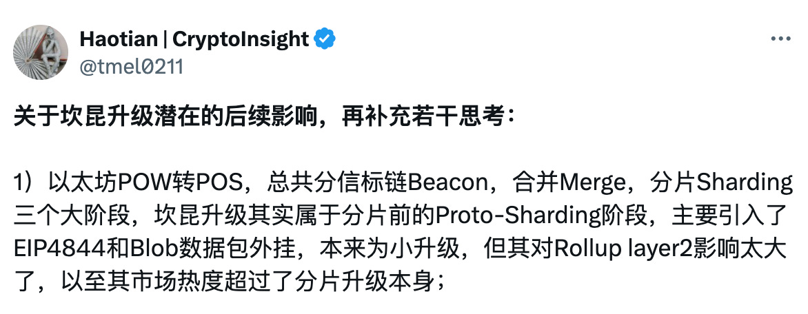 Haotian: 1)以太坊 POW 转 POS,总共分信标链 Beacon,合并 Merge,分片 Sharding 三大阶段。坎昆升级其实属于分片前的 Proto-Sharding 阶段,主要引入了 EIP4844 和 Blob 数据包外挂,本来为小升级,但其对 Rollup layer2 影响太大了,以至其市场热度超过了分片升级本身;
