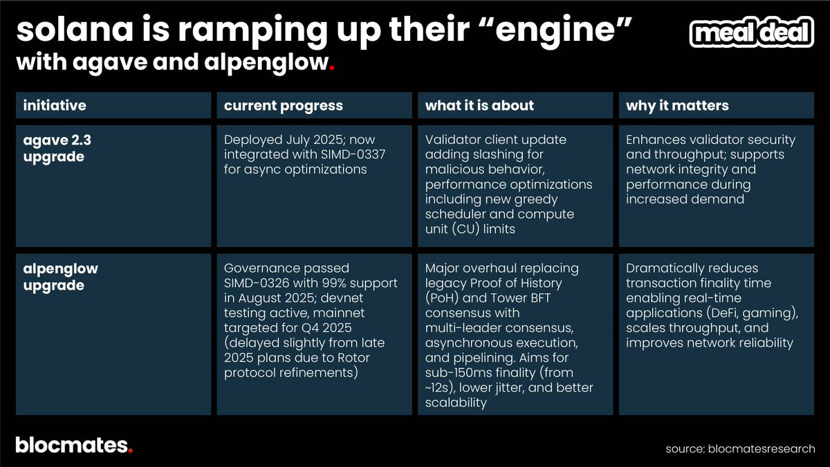 blocmates.:2025 年第三季度的 Solana 呈现出「双线叙事」:表层上,由于「模因退潮」,链上活跃度显著下降,用户交易 dominance 也被竞争链蚕食;但在表层低迷之下,Solana 的底层基本面反而更稳固。核心团队持续交付行业最激进的技术路线图,多项基础设施升级在 Q3 集中推进,TVL 季度增长超过 26%,稳定币供应自年初以来几乎翻了三倍。本季关键技术升级涵盖三个方向:其一是核心引擎(共识与客户端)的大幅重构,包括 Alpenglow、Firedancer 等提升性能、吞吐、节点多样性与客户端安全性;其二是网络高速公路(吞吐与效率),通过改善区块空间、交易大小限制与拥堵控制,使网络真正能承载机构级交易与实时应用;其三是「目的地层」,即开发者与用户直接交互的新特性,包括隐私、ZK、去中心化改善与更强的 DeFi 模块能力。Alpenglow 将最终确认时间降至 150ms,媲美 Binance 与 Aptos;Firedancer TPS 破百万,远超 ETH 及主流 L2;手续费优化让链上微交易、ICO、游戏、HFT 体验更顺滑;隐私与 ZK 则为 RWA、机构合规带来敲门砖。Q3 的标志性压力测试来自 Pump.fun 的 ICO:500M 美元在链上 12 分钟募满,DEX 正常运作,反观多家 CEX 因 API 延迟出现宕机。这次事件提供了一个强烈信号:去中心化基础设施在某些极端场景下已开始超越中心化交易所。