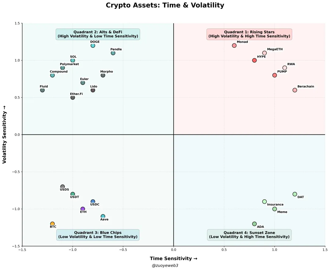 将众多新资产放入新秀区,它们对时间和波动性都较为敏感,本质上属于短期投机资产,只有超越简单的博弈周期,落入稳定的持币人群和使用场景,才能进入山寨区,即对时间不会特别敏感,但是流动性无法抵御剧烈的市场变动,大部分项目会停留在此处。而且,项目方越努力,比如在 ve (3,3)、回购、销毁、合并、更名等措施下,依然可能停留在此处,可以视为平缓的爬坡期,不进则退,努力前进还可能倒退。之后的故事就简单,渡劫成功进入稳定区,成为所谓穿越周期的资产,比如 BTC 和 ETH,或许可以加上半个 SOL 和 USDT,但是绝大部分资产会慢慢死亡,此时既不对时间敏感,也完全没有波动性。Meme 和 DAT 作为一个赛道会长期存在,但是归属其之下的资产很难有长久机遇,而 DOGE 和 XRP 等极少数 Meme 和山寨的代表资产则是离群点。(来源)