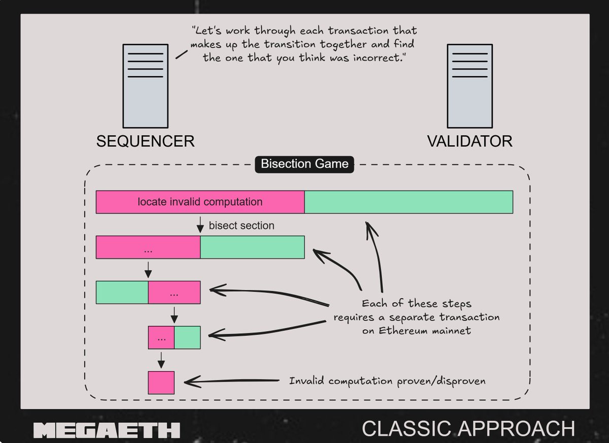 MegaETH:每一个乐观 Rollup 的核心假设是:除非被证明有误,否则提交的状态提议被认为是有效的。但若缺乏强健的欺诈证明机制(Fraud Proof Mechanism),这一假设将无法成立。一旦无效状态未被挑战,或者被恶意挑战者故意拖延结算流程,链的安全性便会立刻失效。为了捍卫这一安全性,乐观型 Layer2 需要支持一个完整的争议解决机制,允许挑战者对排序器提交的状态提议提出质疑。这个机制需要保证两个关键特性:其一,所有错误的状态提议都能被检测到;其二,错误的挑战不能得逞。欺诈证明机制下,单一状态提议通常由三个部分组成:初始状态、交易有效载荷与最终状态,即提议者声称在当前初始状态下,执行这些交易后应当得到特定的最终状态。挑战协议的任务就是验证这种主张的真伪。当前主流的做法是交互式错误证明(bisection game),挑战者与提议者之间来回交互,通过对交易执行轨迹进行二分,逐步锁定错误所在,并最终在以太坊主网上重演关键步骤来验证其正误。然而,这种模式存在诸多问题,包括每一步都需要消耗主网交易、延迟严重、对提议者干扰较大,以及易遭挑战滥用攻击(Griefing),使得该机制在网络高负载下非常脆弱。