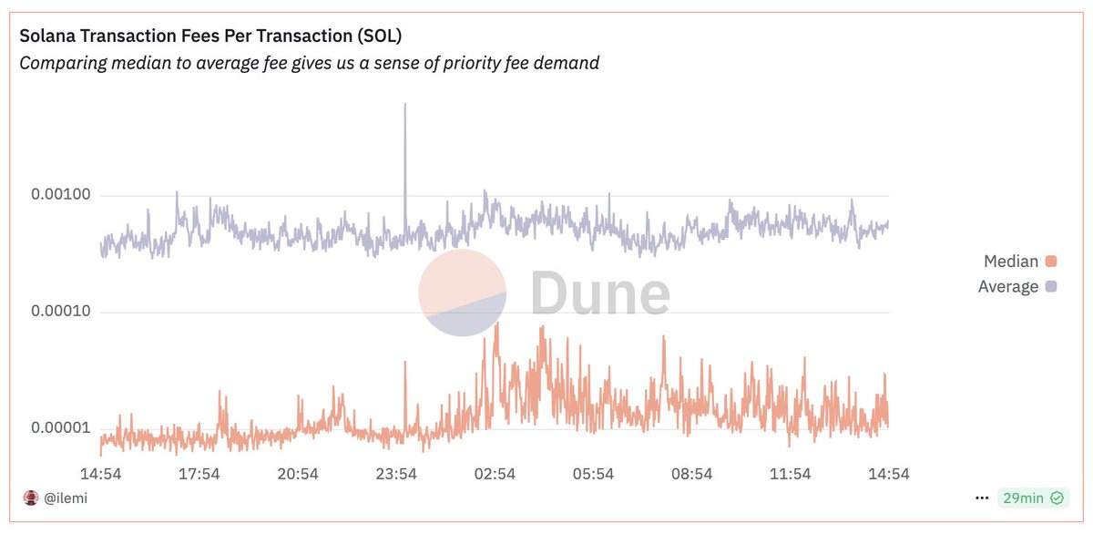 截至发稿时,Solana 上的费用中位数仍在 0.003 美元左右,而且是在 800-2400 用户 TPS 的情况下。当你在 Twitter 上看到钓鱼截图时,几乎可以肯定它要么指的是存储费用(有些交易所会为你支付这一费用,因为它是可以退还的,但 Coinbase 就不会),或者是针对 shitcoin 等单个竞争非常激烈的市场,并不能反映平均用户费用。【原文为英文】( 来源 )