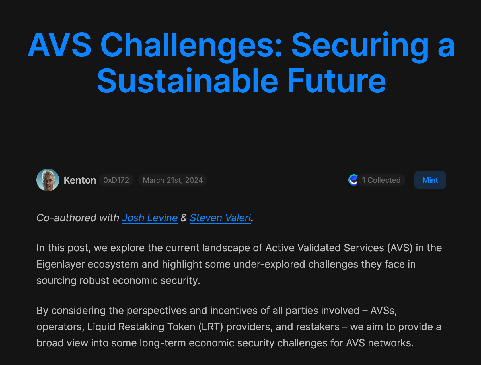 导读:加密研究员 Kenton 在与众多 LRT 团队、AVS 网络和运营商交谈后,撰文探讨 EigenLayer 生态系统中主动验证服务(AVS)的现状,并重点介绍了这些服务在获取经济安全方面面临的一些挑战,旨在为 AVS 网络的长期经济安全挑战提供广泛视角。