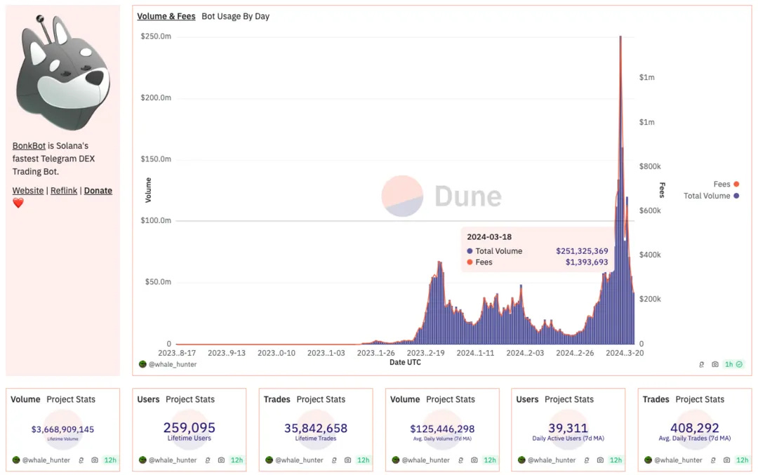 dt: BonkBot:交易手续费:1%;推荐机制:首月赚取交易手续费的 30%,第二个月赚取 20%,永远赚取 10%;是否有代币:无,且明确表示不会发币,将持续赋能 BONK。BonkBot 是 Bonk 社区制作的 TG 交易机器人,也是目前 Solana TG Trading Bot 中交易量第一的机器人。以其简洁的使用界面为特色,具备抗 Mev 交易、调整 Gas Fee 等功能。最高峰 3/18 单日交易量突破 250M,单日手续费收入达 1.4M 美元。目前数据回落,平均每日交易量约 50M。