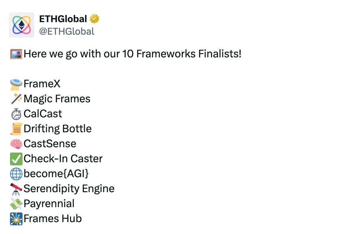 导读:上周末,ETHGlobal 和 Paradigm 在纽约举办 Frameworks 黑客松,针对 Farcaster Frames 进行开发。ETHGlobal 撰文介绍 10 个入围决赛的项目。
