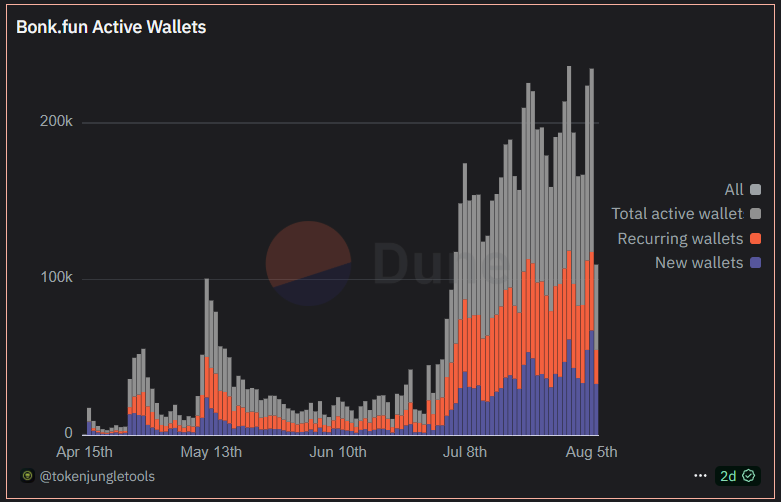 Castle Capital:自 2025 年 4 月 LetsBonk.fun 上线以来,这个基于 Solana $BONK 代币的 Meme 币发行平台迅速崛起,并在 7 月中旬的日活跃度、代币发行量等关键指标上超越老牌对手 Pumpfun。当时,LetsBonk 日均发行量高达 2.8 万枚代币,而 Pumpfun 仅 3500 枚;日交易量(1.79 亿美元对 5200 万美元)和 30 天手续费收入(1451 万美元对 2329 万美元)也形成压倒性优势。LetsBonk 主打社区优先理念,推出治理代币,并向代币创建者分成 1% 交易手续费(远高于 Pumpfun 后来跟进的 0.05%)。其手续费分配模式也具吸引力:50% 回购销毁 BONK、8% 用于储备等,形成正向激励。相比之下,Pumpfun 在 7 月 12 日的 $PUMP 代币 ICO 虽募集 5 亿美元,但因社区不满其圈钱印象,代币上市即腰斩超 50%,被迫启动数百万美元回购以稳价。然而近期形势出现反转:Pumpfun 在 8 月初 24 小时内创建超 1.5 万枚代币,重新超越对手。为扭转颓势,Pumpfun 自 5 月起已开始向创作者分成 0.05% 手续费,以激励长期运营并减少秒跑路行为。