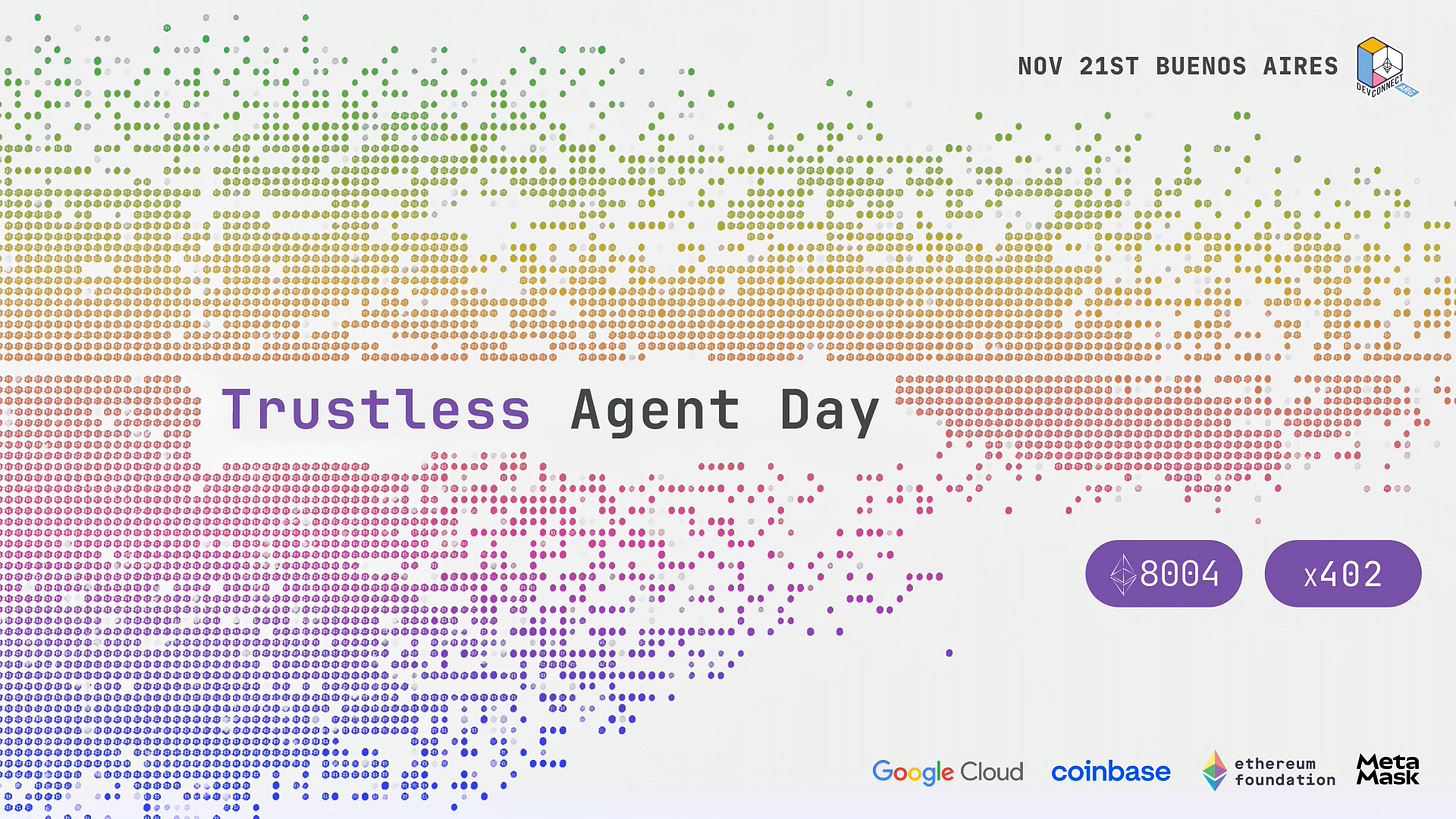 在刚刚结束的 Devconnect ARG 2025 期间,一场名为 Trustless Agent Day 的活动成为了整个大会最瞩目的焦点之一。本次活动由 以太坊基金会(EF)、Coinbase、MetaMask 等行业巨头联合核心开发者社区共同发起,其规格之高、话题之硬核,标志着 Web3 与 AI 的结合已经从概念炒作正式迈入了「标准化基建」的新阶段。活动的愿景非常清晰:终结 AI Agent 仅作为 API 简单包装(Wrapper)的草莽时代,通过 ERC-8004 和 x402 协议,构建一个无需许可、可互操作且自带支付能力的真正的智能体经济(Agentic Economy)。