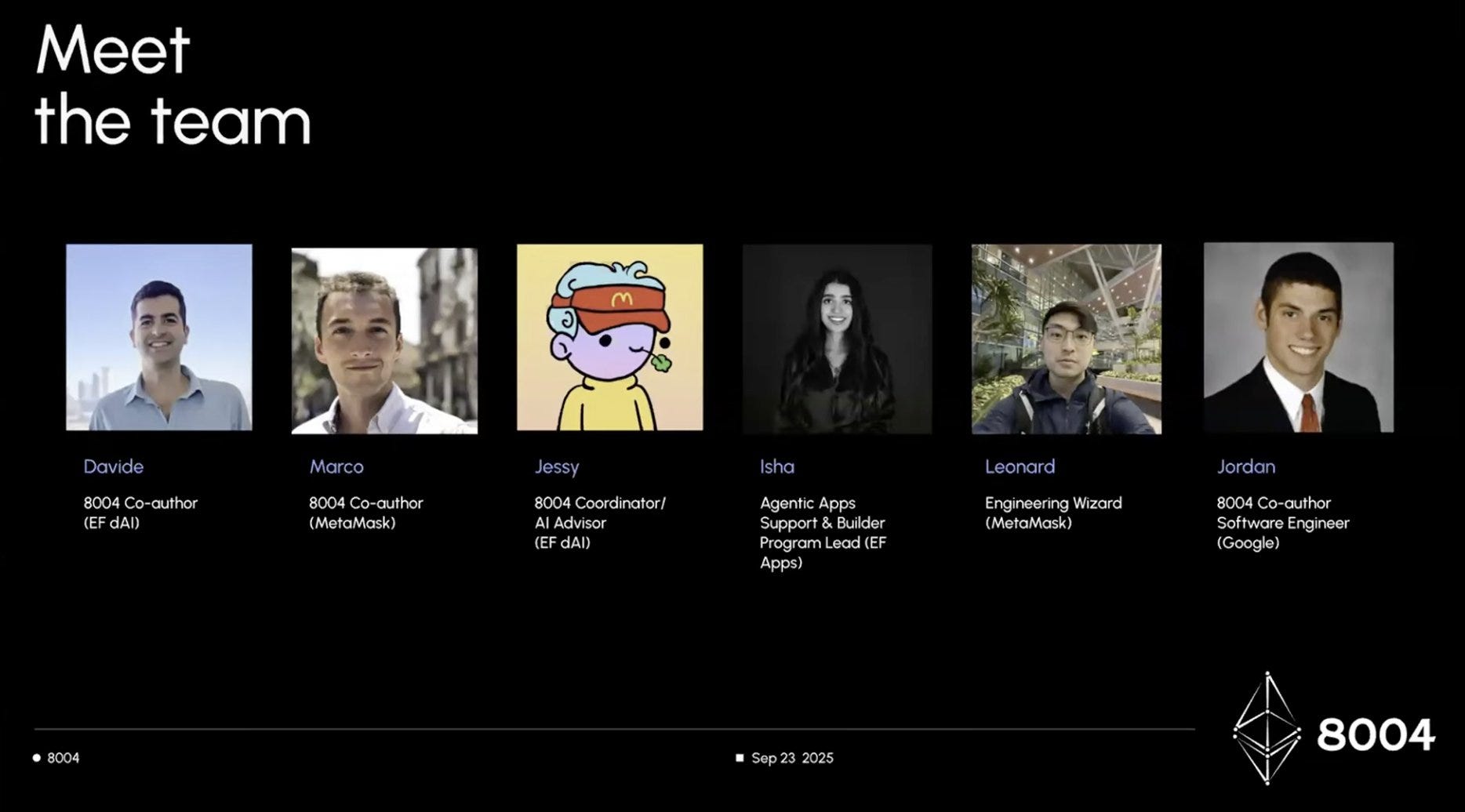 ERC-8004 是以太坊基金会主导的一项关键标准,旨在建立 Web3 环境下 AI Agent 间无需预先信任的协作机制。这一标准脱胎于谷歌 2025 年 6 月开源的 Agent-to-Agent(A2A)协议,并由以太坊基金会 dAI 团队(负责人 Davide Crapis)与 MetaMask、谷歌等机构合作,于同年 8 月正式提出,以期让以太坊成为 AI 智能体经济的默认协调和结算平台。最终标准有望于 2025 年 11 月在 Devconnect 正式发布。